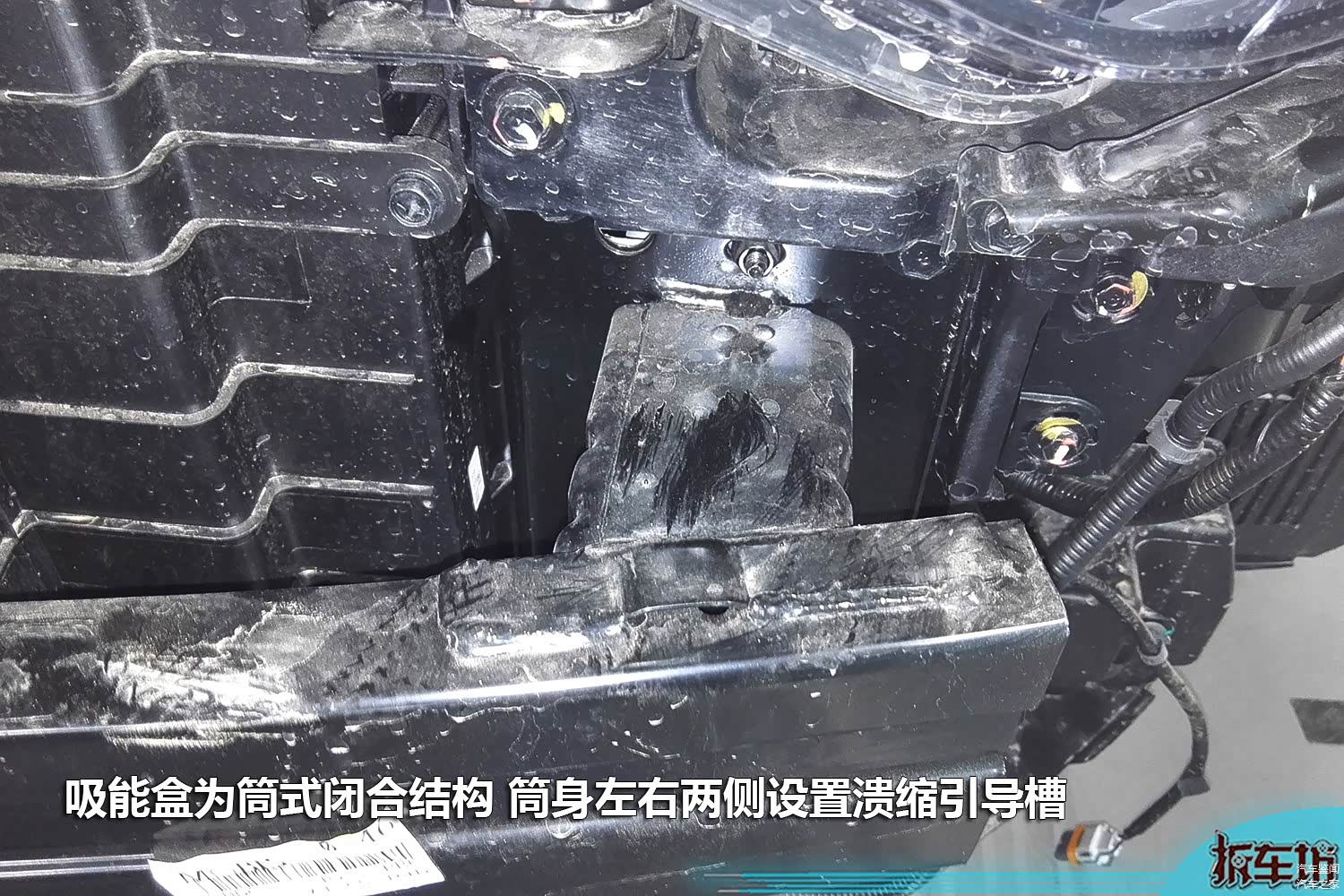 前部吸能盒在整个前部防护结构中有着至关重要的作用,它承接了前防撞梁传递过来的碰撞能量,并利用自身产生的溃缩变形吸收大部分碰撞能量,并且变形方向也有讲究,这就是靠吸能盒体上设置的溃缩引导槽来实现的,没有被吸收完的碰撞能量在吸能盒压缩到极限之后,继续向车身纵梁传递,将碰撞能量传递到车身骨架,以减少驾驶舱的变形程度,从而达到尽可能大的保证驾乘人员的生存空间。