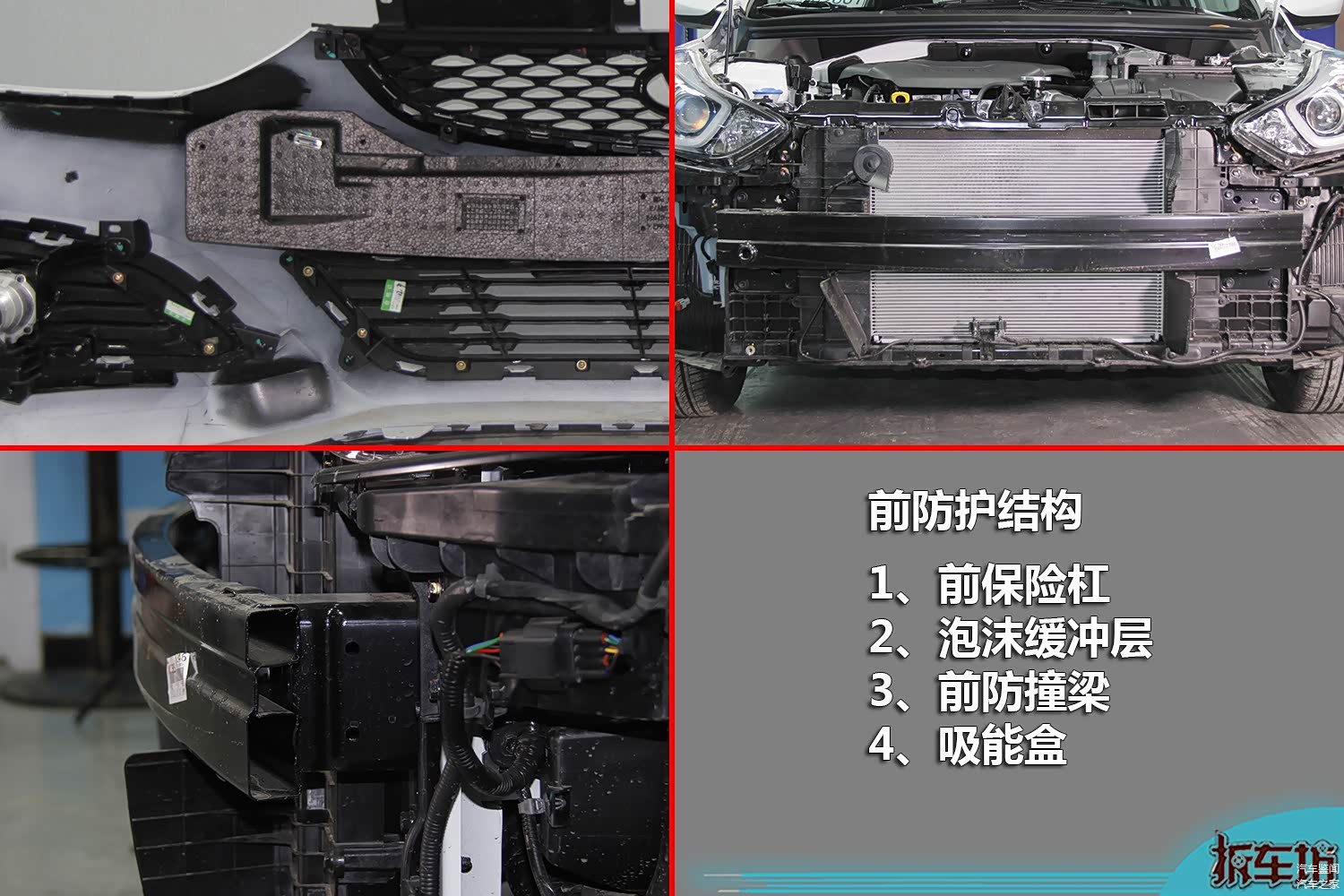 我们来看看全新朗动前部防护结构包括:前保险杠外皮、二级缓冲层、前防撞梁和吸能盒,吸能盒通过法兰盘。