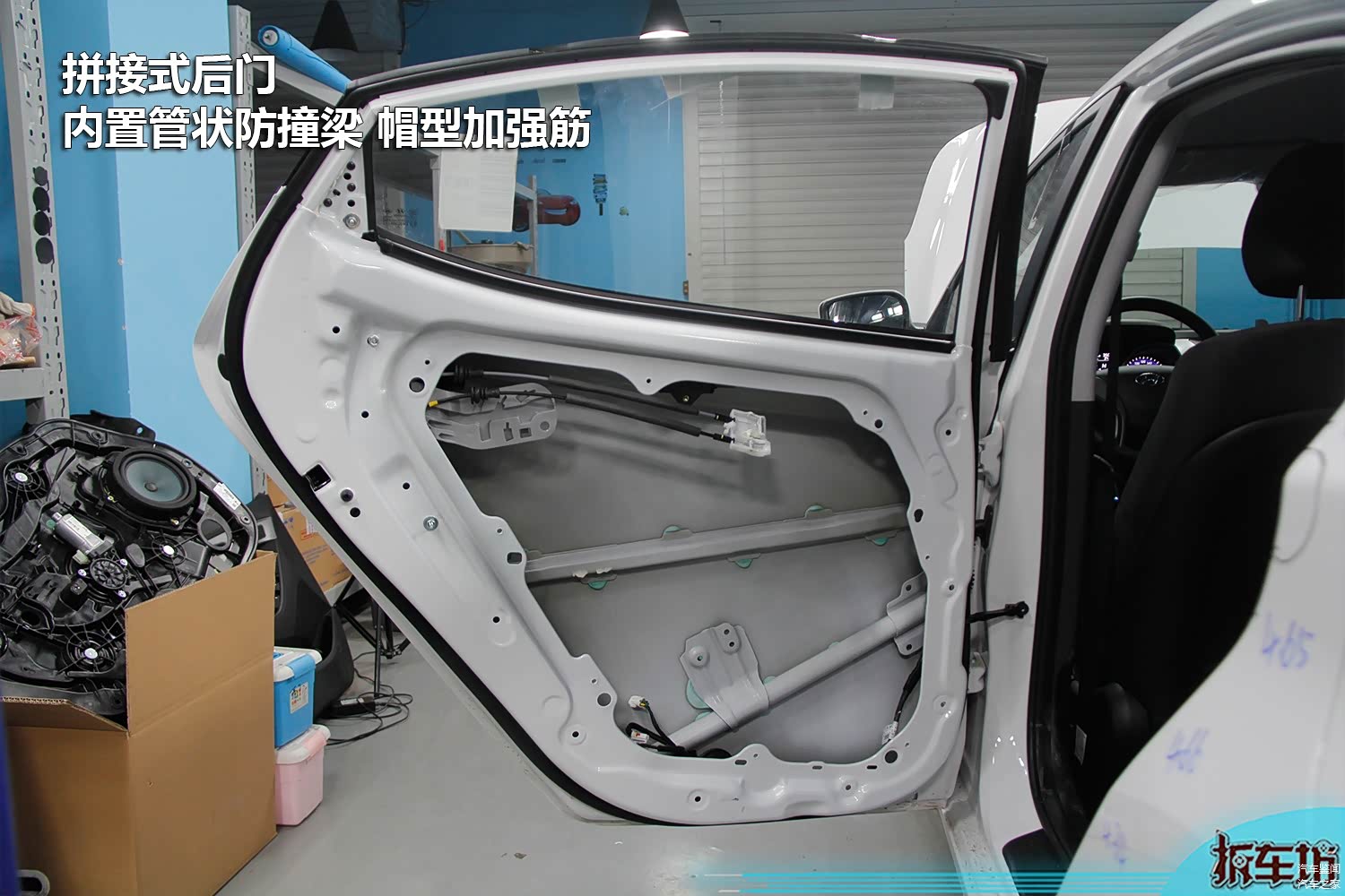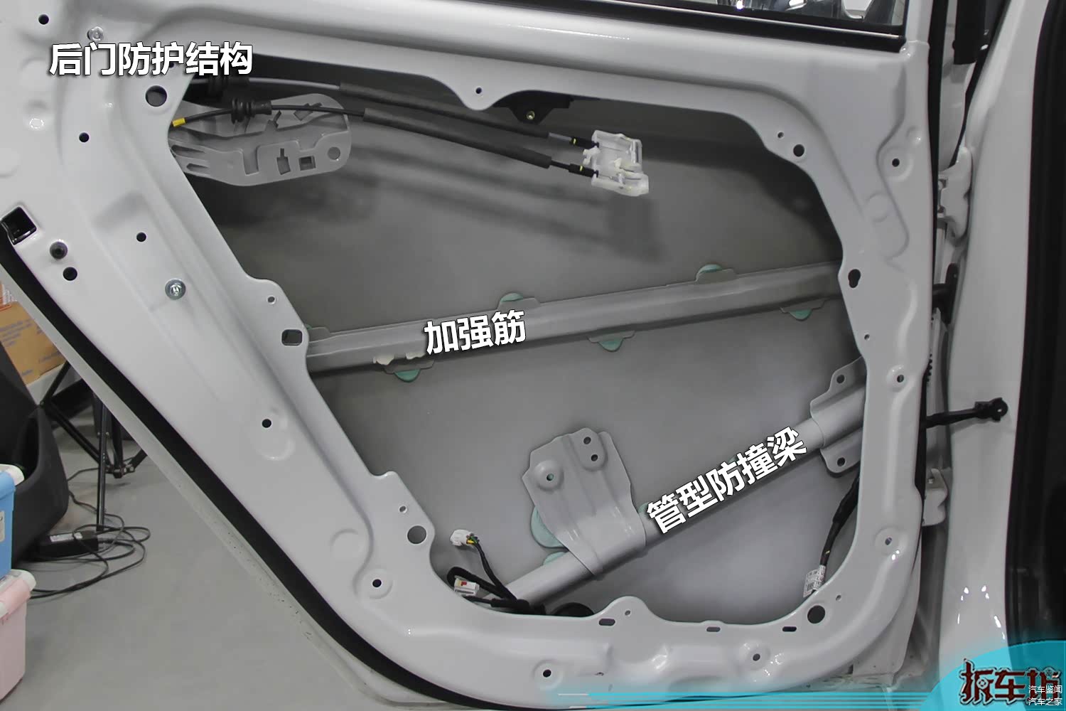 车门内部设置了管型防撞梁+帽型加强筋,这也是目前主流的车门防护形式。