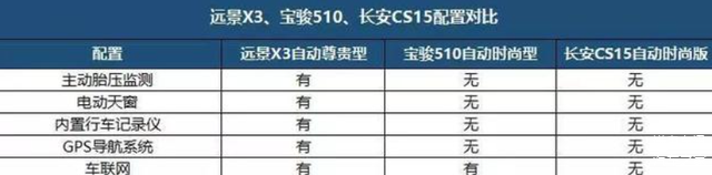 在这里,将远景X3、宝骏510、长安CS15这3款热销SUV的配置方面做一个横向对比,通过对比可以明显看出,远景X3的配置要多于宝骏510和长安CS15。这样也就不难看出,远景X3在配置方面具有绝对的优势。这款车不到6万元的价格,销量也是最好的,它让很多买车预算不高的人实现了有车的梦想。
