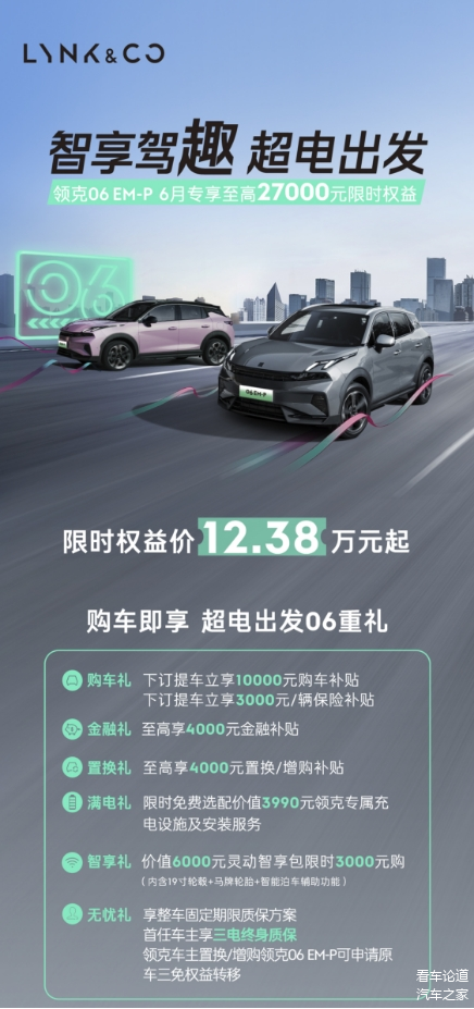 今年5月,领克06 EM-P焕新推出了全新126长续航Max版,同时,Halo版新增智能泊车选装包进一步强化了智能SUV的定位,为年轻消费者带来了更多元的用车场景。值得一提的是,领克06 EM-P还推出了12.38万元的限时权益价和多重购车好礼,迅速在市场上赢得了不少消费者的青睐。
