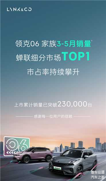 在竞争激烈的汽车市场中, 领克06(图片 | 参数 | 询价)凭借其卓越的产品力和精准的市场定位,迅速赢得了广大消费者的青睐。尤其是在年轻一代中,领克06已经成为炙手可热的车型。在2020年上市至今,已收获23万车主的青睐,而在今年的3-5月,领克06连续三个月稳居细分市场销量Top1的佳绩,更是其市场竞争力和品牌影响力的有力证明。