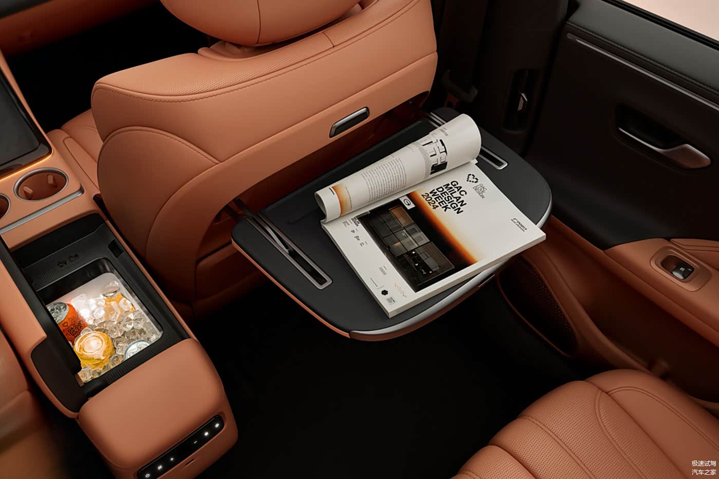 正如上文所言,不要因为全新AION V的外观就不去了解它的内在,其实它并不缺好东西。譬如在前排中央扶手箱的位置就配有温控范围在-15°-50°的车载冰箱,家人在夏天、冬天能分别喝冷饮和温水。另外,它的副驾驶座椅除了有按摩外,还能完全放平,午休时可以把它当作床来用,而像7kW的对外放电、副驾驶侧后排座椅的小桌板它也有。