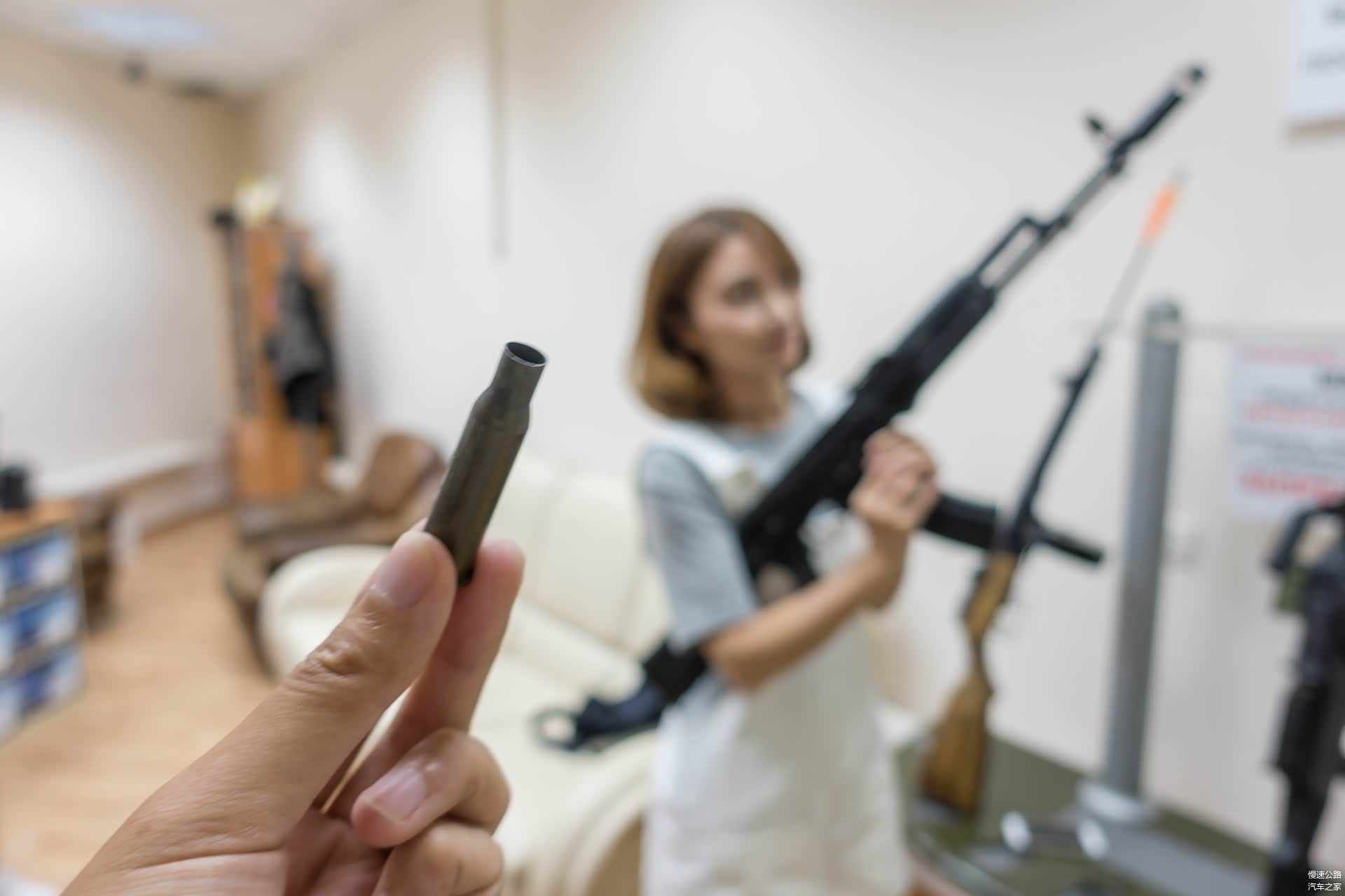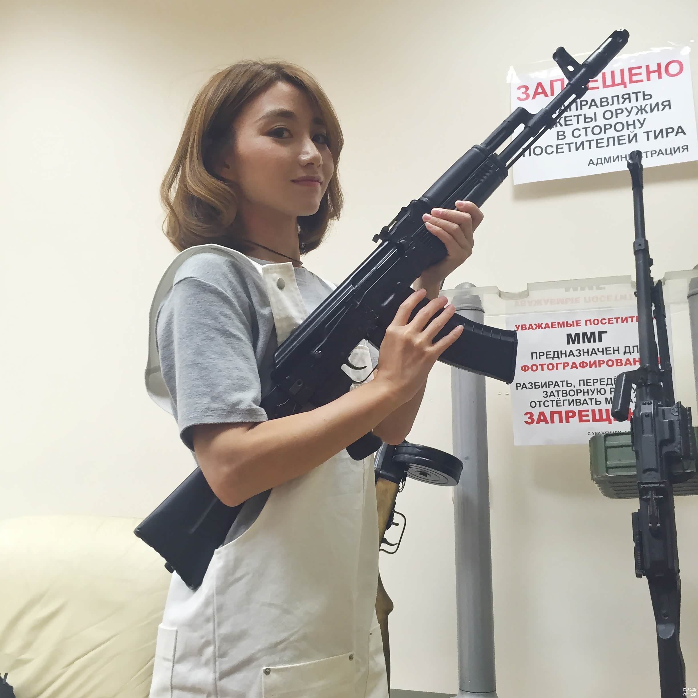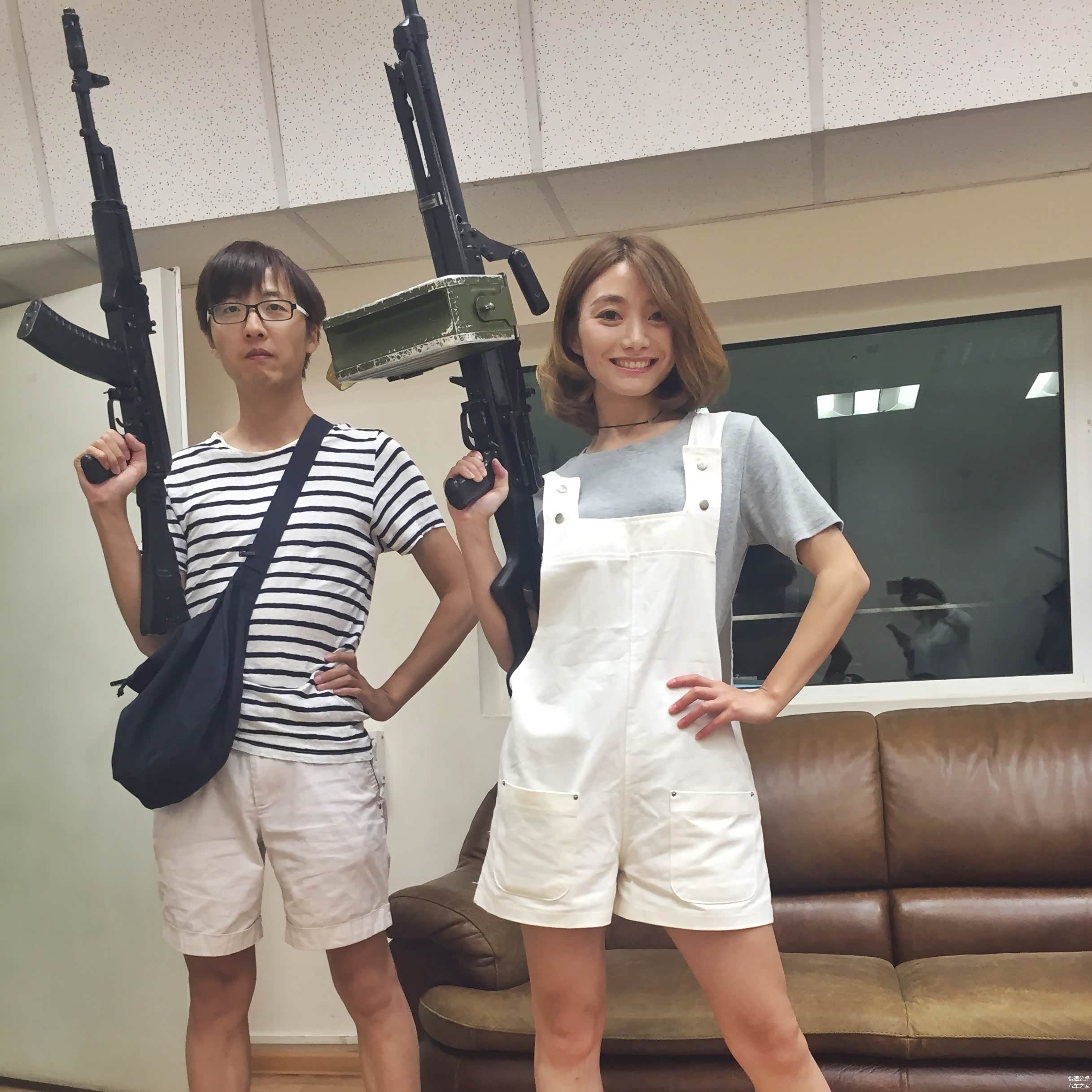 下地下室,进小黑屋,门口就竖着几把毫无遮挡的真枪,一位面无表情的年轻男人头也不抬地“欢迎”我们到来。气氛尴尬,手痒不止,顾不上解释了,依次扛起来拍几张装逼照再说。每把真枪自重9-12斤不等,别说女生了,就是男生单臂扛一会儿也有点吃不消。