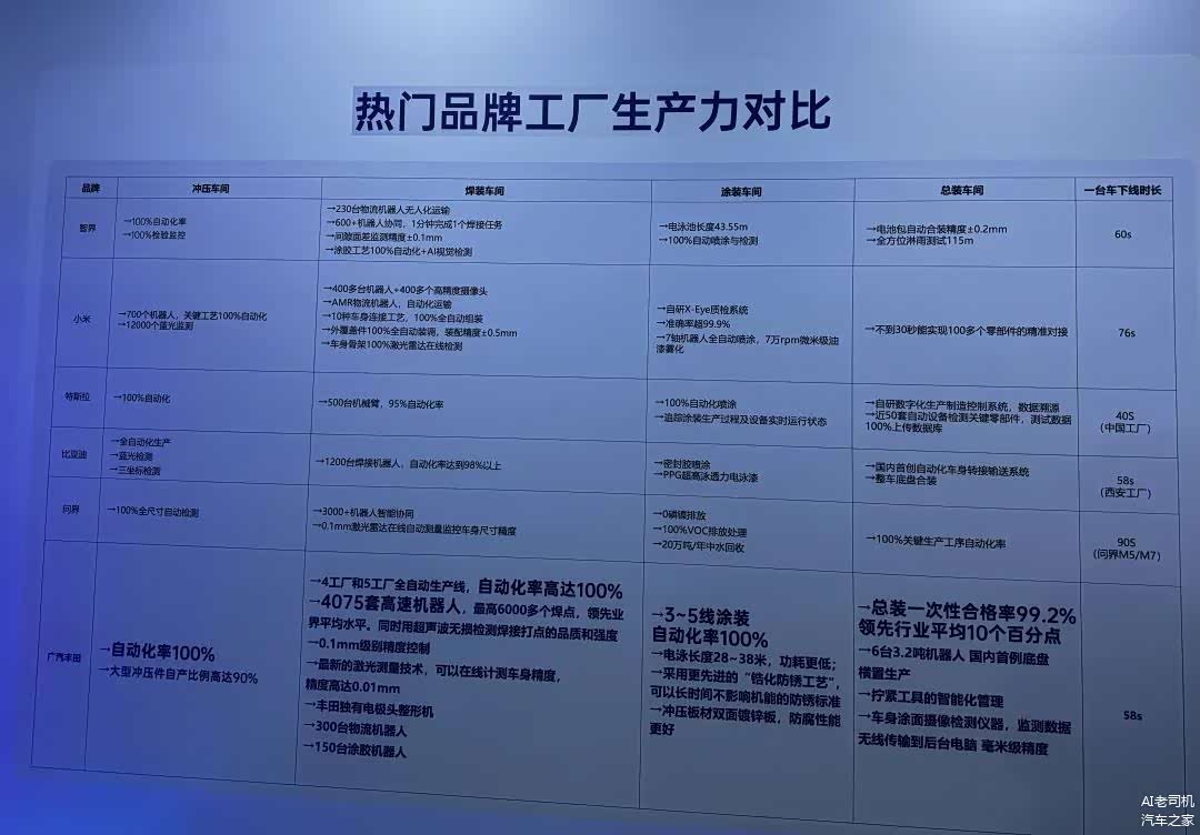 在科技日会场外的展示区,广汽丰田将各家工厂生产力对比。相比于智界、小米、特斯拉、比亚迪、问界,广汽本田生产一辆车所用时间仅次于特斯拉,与比亚迪西安工厂保持一致。