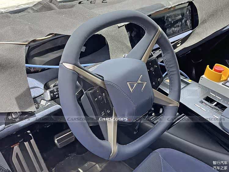 难得的是,此次谍照也曝光了这台 DS8 新车的内饰。它将采用业内罕见的 X 型四幅方向盘设计,并通过金属与皮质搭配,结合触控式按键,科技感浓郁。此外,新车还将搭配类似双联屏的全液晶仪表和中控屏幕,多媒体方面的体验也更加优秀。