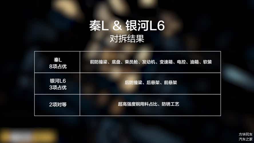 对拆结果,比亚迪秦L 相比较吉利银河L6做到了8项领先,分别为:前防撞梁、乘员舱、底盘、油箱、发动机、变速箱、电控、车内软装。银河L6在后防撞梁、前悬架、后悬架表现的更胜一筹。防锈工艺、超高强度钢用料占比方面,比亚迪秦L与吉利银河L6不相伯仲。