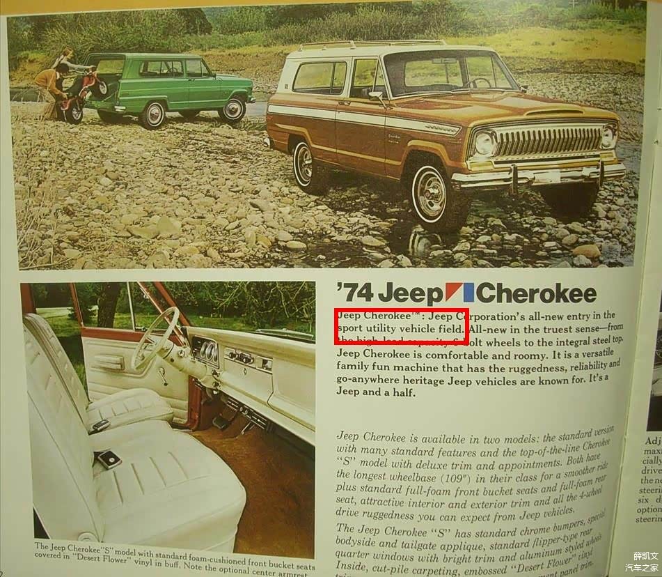 对于第一代切诺基我们不得不提到的是,在1974年切诺基销售手册上面出现的一个术语——Sport Utility vehicle(运动多功能车型),而这个Sport Utility Vehicle所代表的车型就是眼下的SUV。没错,SUV这个词就是这么来的,由第一代Jeep切诺基定义的。