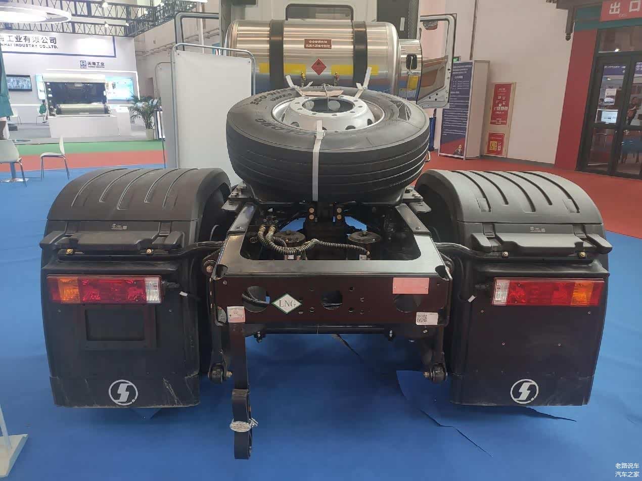 实拍的陕汽德龙X5000 LNG牵引车气瓶采用背驮式设计,安装在驾驶室后部的车架上方。单气瓶配置,气瓶容积达1500L,保障出色的续航能力。