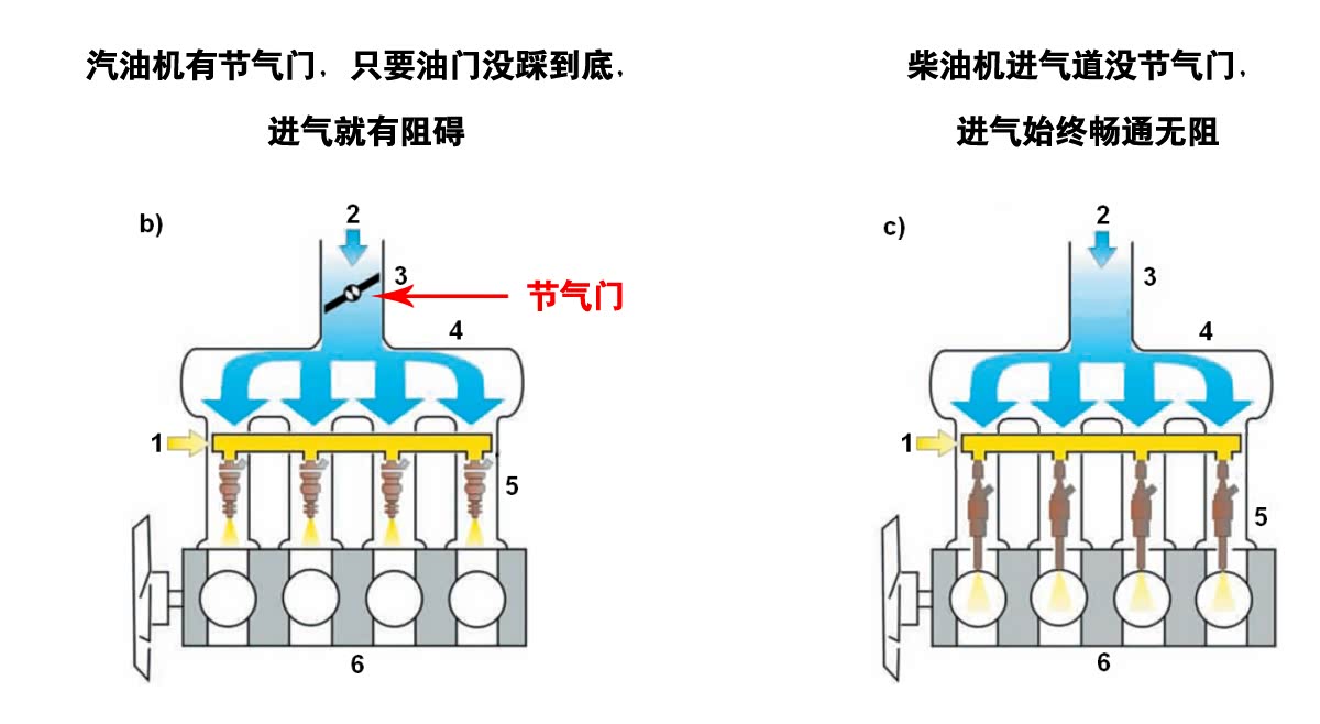 而柴油机是压燃的,我管你油多还是气多,只要温度合适我就能着火。所以柴油机不需要节气门,进气道始终最大程度敞开,只靠调节喷油量就能控制动力输出,活塞吸气就省力多了,泵气损失低了效率自然就升高了。