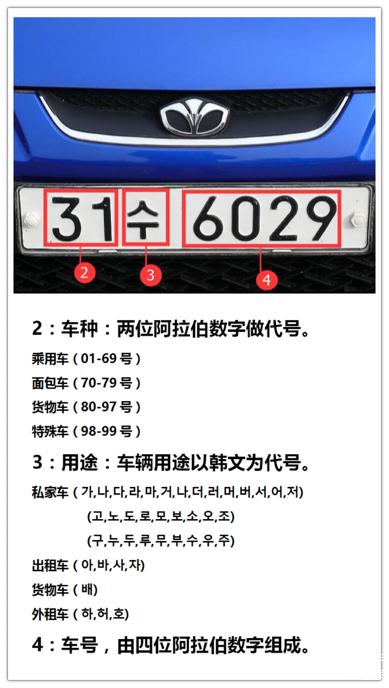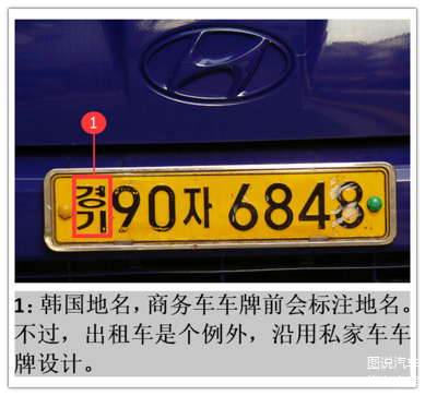 韩国私家车车牌是234组合,白底黑字;商用车车牌是1234组合,黄底黑字。