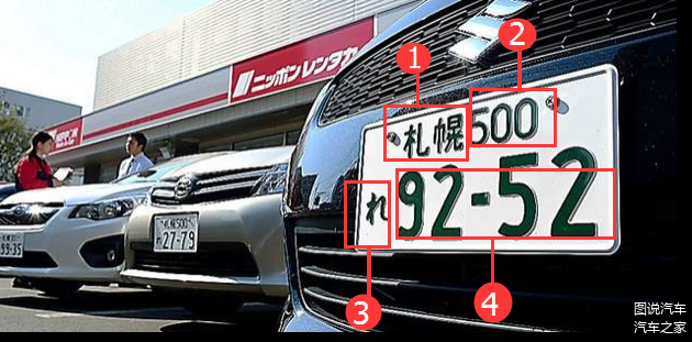 日本车牌充分体现了日本人做事一丝不苟认真样子,基本以1+2+3+4构成,私家车车牌是白底绿字;商用车车牌是绿底白字。上图例:
