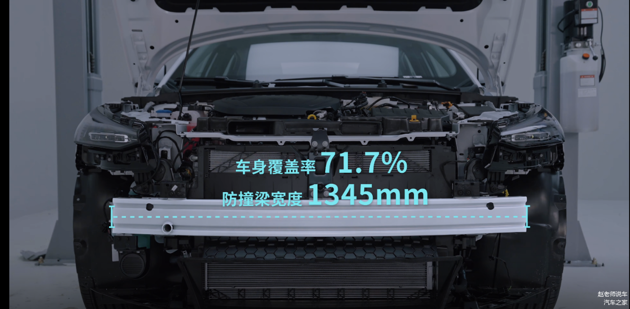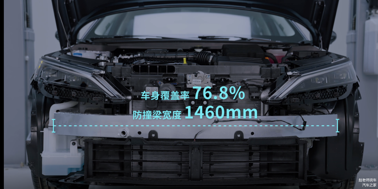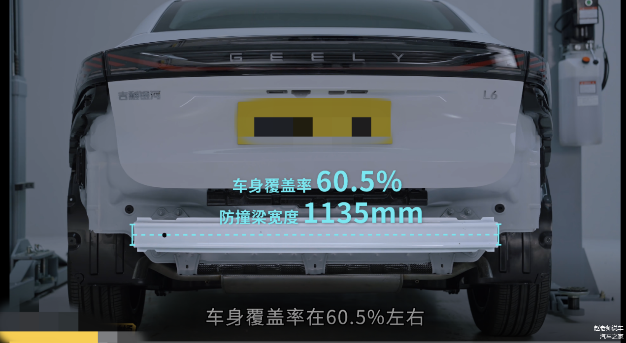 首先我们来看一下前后防撞梁方面的对比:秦L的前防撞梁宽度达到了1460mm,车身的覆盖率为76.8%,有2个主吸能盒和2个副吸能盒,还有额外的防撞横梁,而银河L6的前防撞梁是1345mm,车身覆盖率是71.7%,所以前防撞梁是秦L领先银河L6;