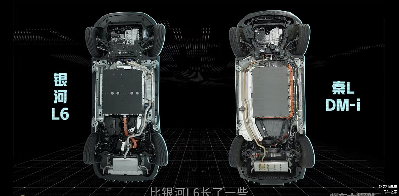 在底盘上,两个车都是前麦弗逊+后四连杆的设计,但是细节有不同,而银河L6前悬挂是钢制下摆臂的双层冲压工艺,铝合金的转向节和铝合金的轴承座簧下质量更轻,用料更好也有利于操控性能的提升,而秦L底盘是纯平的设计,悬挂是钢制的全框式副车架的结构,没有补丁,可以避免共振问题,后悬挂是体积更小,牺牲了一定的操控性,但是舒适性有所提升,也给后面的油箱留出了足够的空间,即使秦L用了65L的油箱,后排依旧有比较大的空间冗余。在底盘上面的覆盖海绵,秦L是一整块面积的发泡海绵,可以更好的控制车辆底盘的噪音,银河L6为部分拼接,拼接的位置容易有噪音的传递。