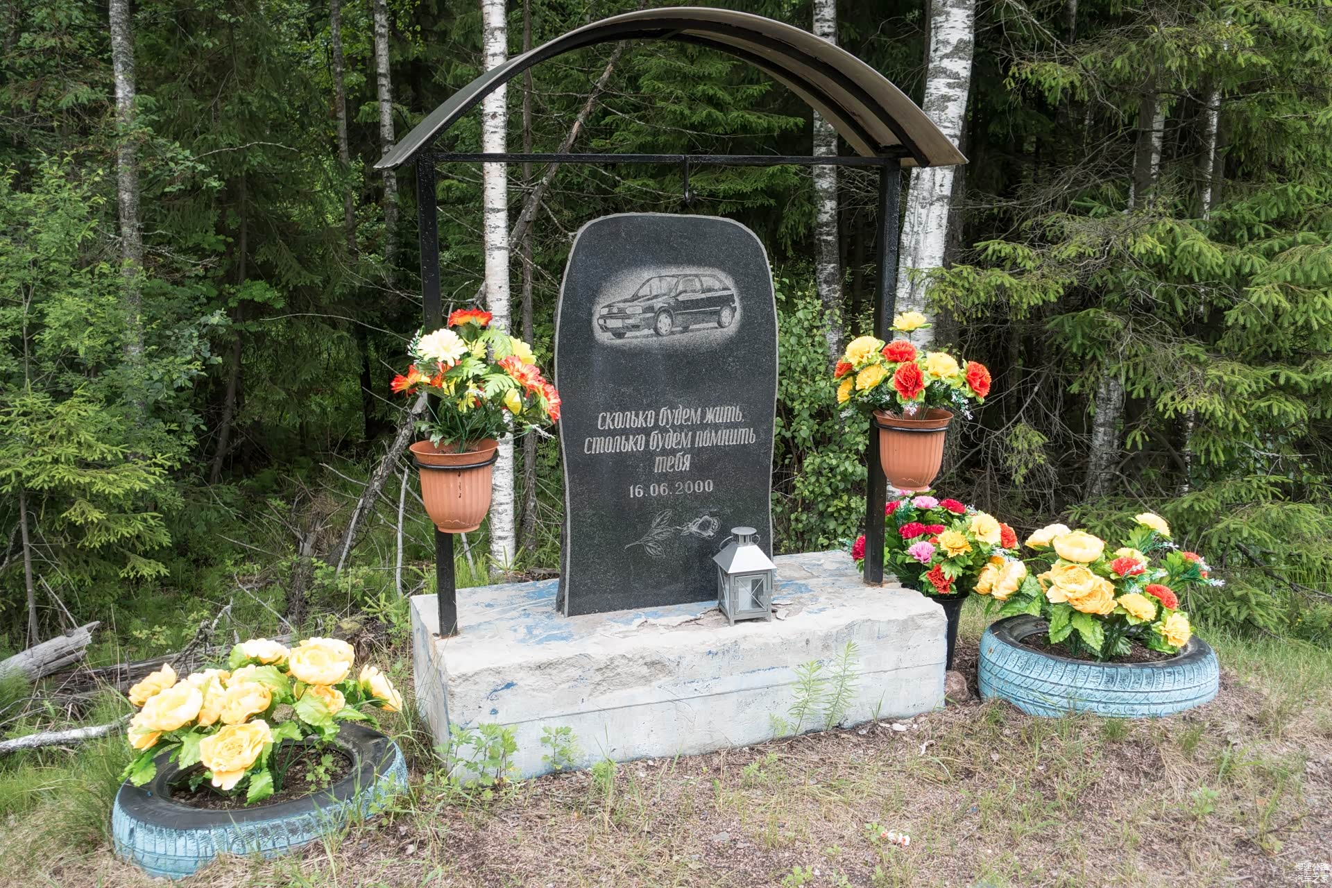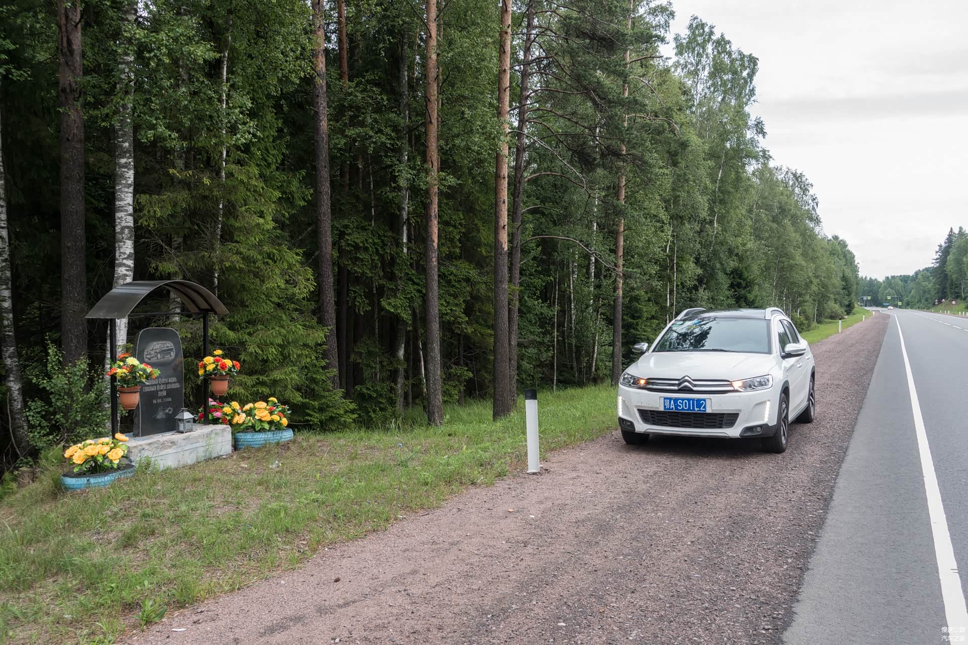 在俄罗斯行走,公路旁时常会出现墓碑,有些挂着个方向盘,有些放这个保险杠,这样墓碑主人,都是不幸在车祸中丧身的人。比如这个墓碑算是此行9000公里以来最豪华的一个,碑上甚至刻有一辆大众高尔夫,大概它的主人生前就是在这辆车中遇难的吧,可见车主曾经也是一位爱车之人。