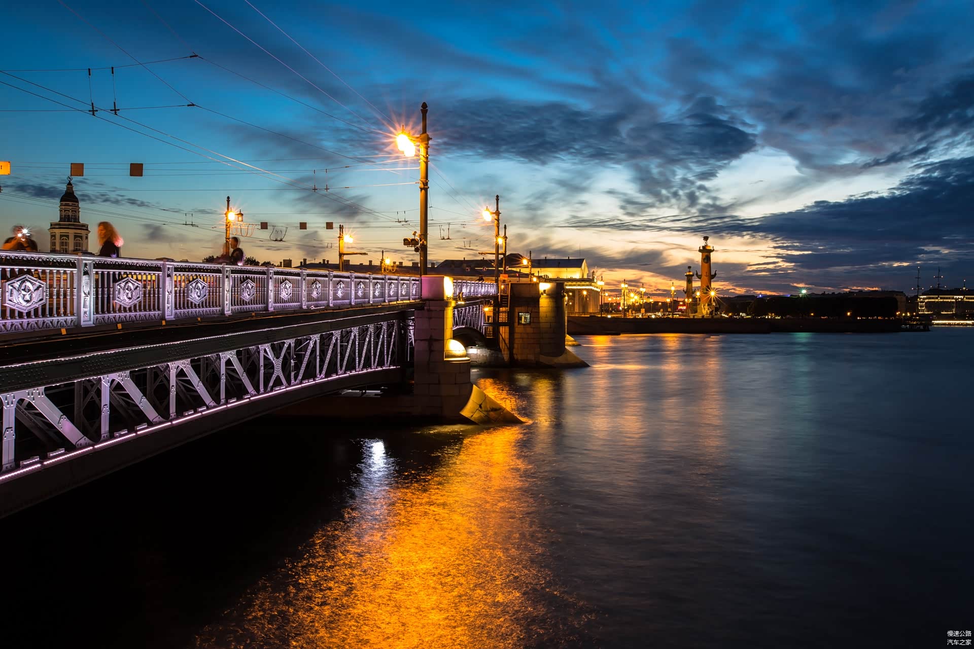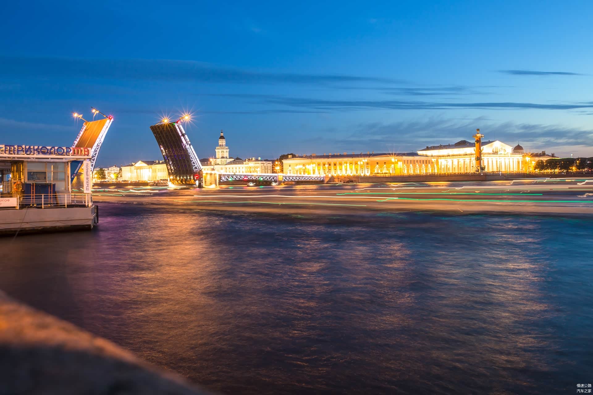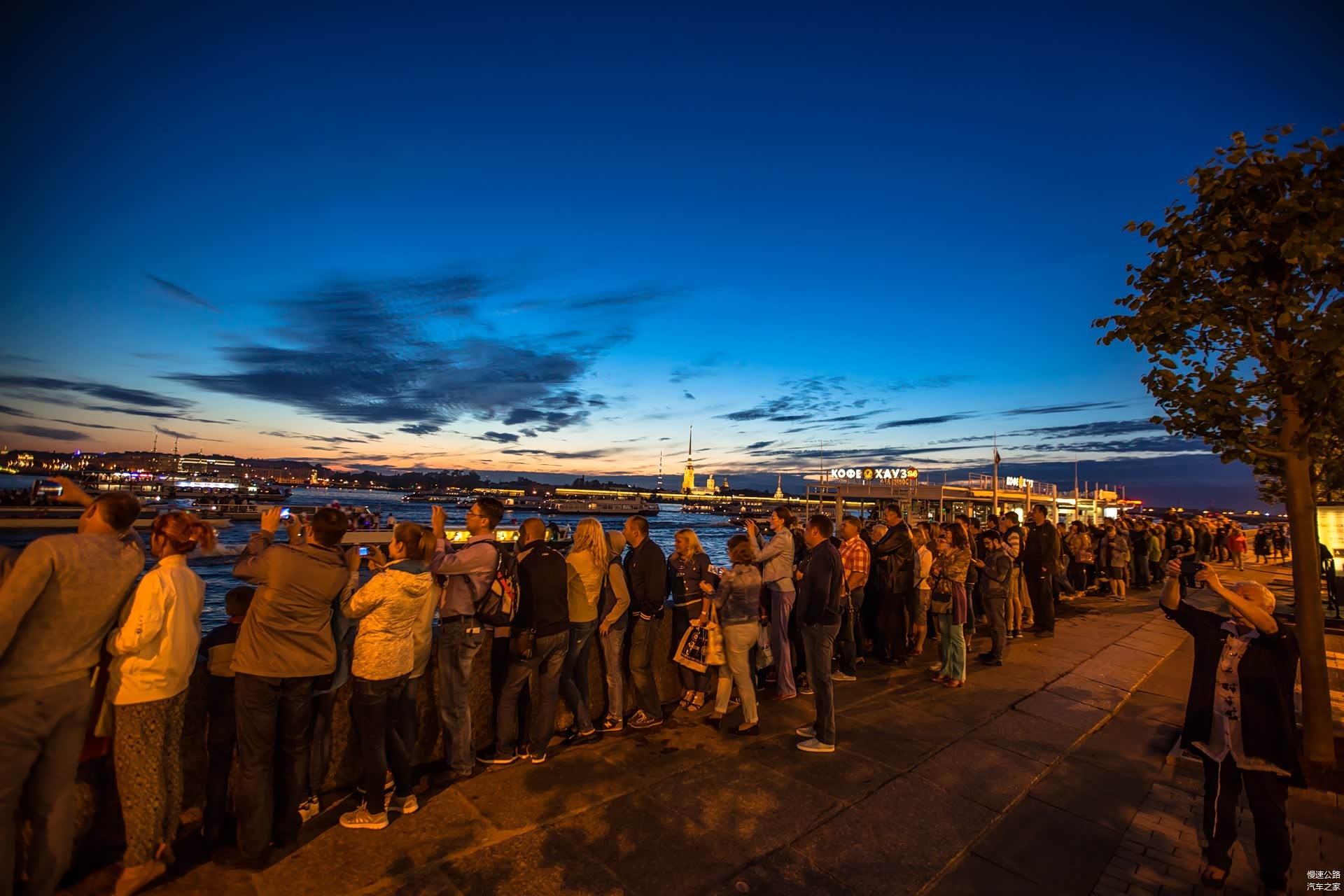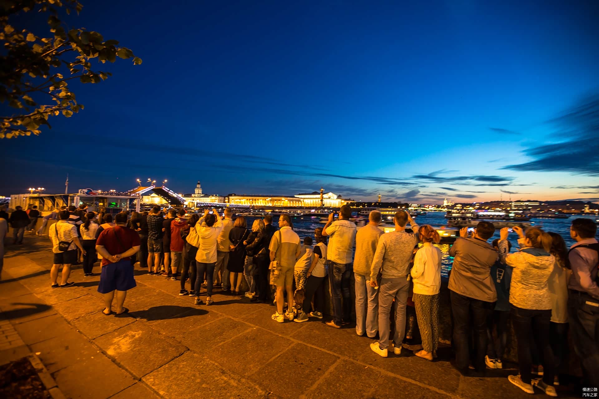 整个游船队伍巡游通过大约持续了五分钟,总数不下百余条船,而这只是每天晚上开桥活动附带的游览项目而已。在这些游船悉数通过之后,才是轮到那些真正需要趁着夜色桥梁开启之际通过涅瓦河的大型商船的戏份。原本开桥就是为了这些商船们通过的需要,如今却已经成为了这座城市最独特的一幕。整个开桥活动大概只持续了三十分钟,随着所有船只通过,桥梁再次合拢,桥上的车道恢复了车水马龙,而两岸的人潮也逐渐退去。属于这个城市安静的夜晚,此刻才算正式开始了。