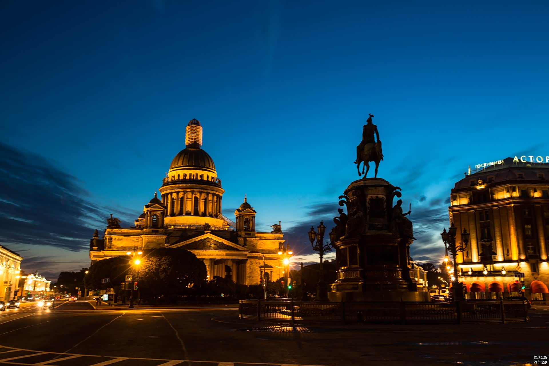 站在枢密院广场的彼得大帝青铜骑士像下,前方就是彼得大帝一直凝视着的涅瓦河畔的方向,而在身后,百米高的地标伊萨基夫斯基大教堂在夜晚十一点的蓝色天际中显得更加浓重。沿着滨河路继续往冬宫方向走,河边聚集的人气愈加旺盛,冬宫门口一定是观看开桥最佳的位置之一。