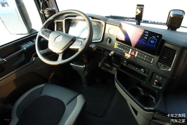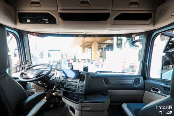 皮质气囊减震座椅可多项调节,并带有通风加热功能;四幅式多功能方向盘能大角度调节,集成有定速巡航和蓝牙电话接打等功能,皮质包裹下的抓握感明显提升;怀挡设计的换挡执行机构还集成了液力缓速器操控,挡位切换的功能控制更便捷;12.3寸液晶悬浮屏接入了导航、影音娱乐等功能,并支持360°全景影像与四路影像。