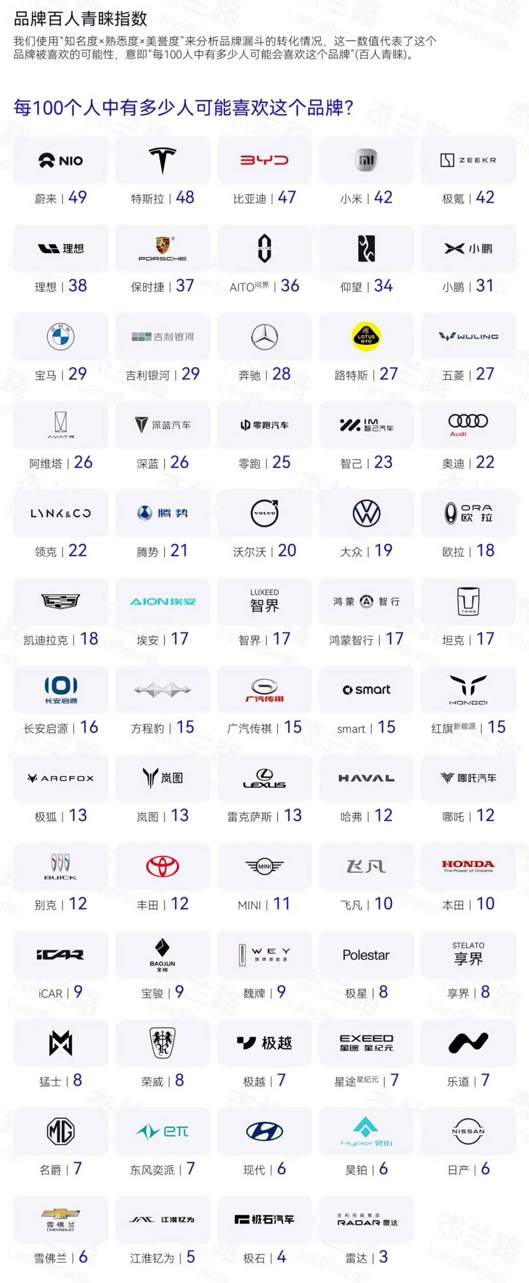 近日,分析机构杰兰路发布了《2024年度上半年新能源汽车品牌健康度研究报告》,其中有一项“每100个人中有多少人可能喜欢这个品牌?”的调查中,哈弗的得分为12分,和丰田、别克等合资品牌相当,而同为传统车企品牌的吉利银河、长安深蓝、五菱等得分均在20分以上。