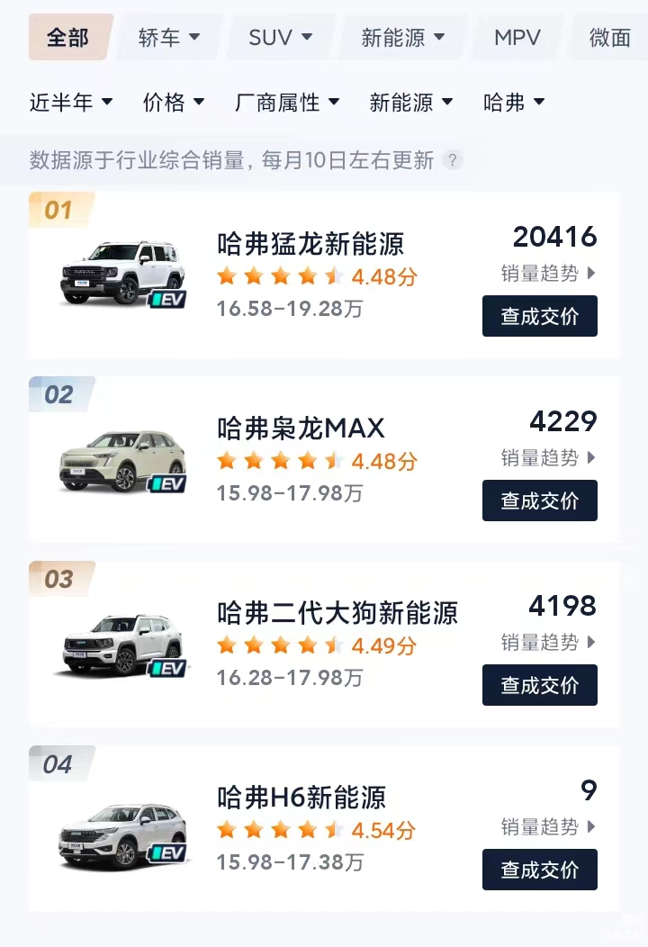 但曾经燃油车时代的哈弗有多牛,如今卖起电动车来就有多寸步难行。目前,哈弗共有4款新能源车型在售,分别是哈弗猛龙PHEV、哈弗枭龙MAX、哈弗二代大狗PHEV以及哈弗H6新能源。过去半年,四款车累计卖出了28852辆,其中猛龙贡献了20416辆,而哈弗H6新能源贡献了9辆。