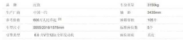 动力方面,红旗L5搭载代号为CA12GV60-01的V12发动机,排量6.0L,最大功率300kW,最大扭矩550N·m。同时配备双向充气式液压减震器。发动机重量:310KG,红旗L5用百公里加速是8.3秒,最高速度220km/h,综合油耗高达20L。匹配6速手自一体变速器。采用四连杆独立前悬架和多连杆独立后悬架,