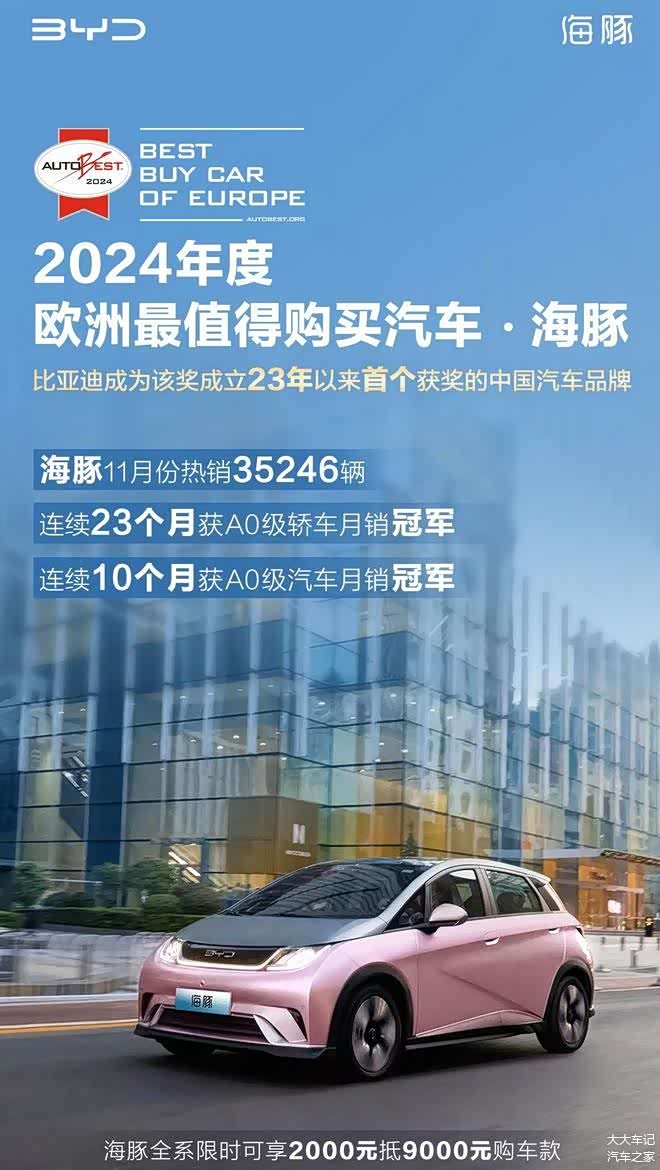 与元PLUS相同,海豚同样是比亚迪出海的全球化车型之一,在海外市场同样备受关注和欢迎,也曾拿下多个国家的纯电车销量冠军。并且专业认可上,海豚还荣获由AUTOBEST评比的“2024年欧洲最值得购买汽车”奖项,受到海外的专业认可。