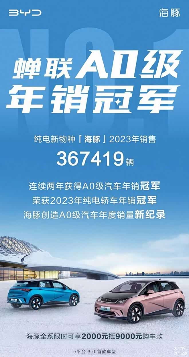 比亚迪爆款制造机的称号无人不知,今年300万辆的年度销量创造了无数的爆款车型。其中纯电新物种——海豚在2023年累销367419台,同样成为一款爆款车型。并且,海豚连续两年获得A0级汽车年销冠军,并荣获2023年纯电轿车年销冠军,并以超36万辆的成绩刷新A0级汽车年销新纪录。