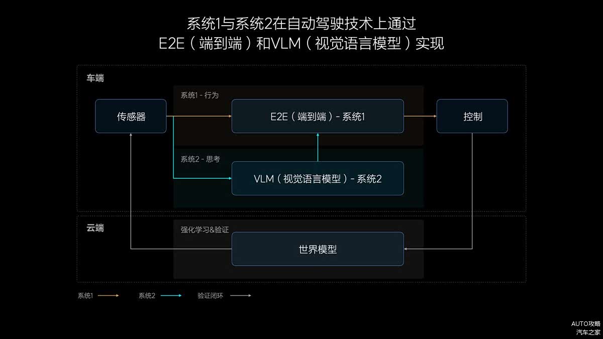 此外,理想汽车基于快慢系统系统理论还形成了自动驾驶算法架构的原型。其中,「快系统」通过先进的端到端模型实现,直接接收传感器数据,迅速转化为精准的行驶指令,确保响应速度与效率。而「慢系统」则依托VLM视觉语言模型来实现,在接收到传感器信息后,进行深思熟虑的思考,再将这些决策传递给「快系统」,共同编织出一张覆盖全面、灵活应变的自动驾驶网络。而这一双系统架构还将在云端借助世界模型进行持续优化与验证,不断推动自动驾驶技术向更高境界迈进。