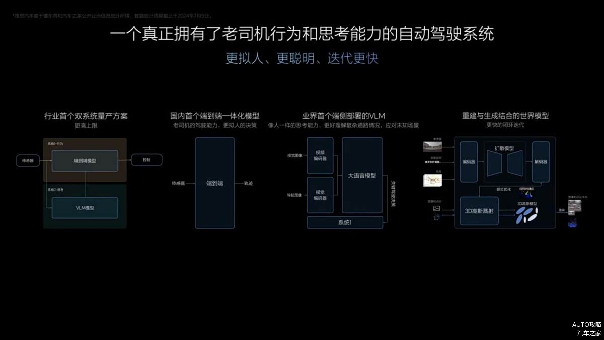 2024年7月5日,理想汽车在2024智能驾驶夏季发布会宣布将于7月内向全量理想AD Max用户推送「全国都能开」的无图NOA,并将于7月内推送全自动AES(自动紧急转向)和全方位低速AEB(自动紧急制动)。同时,理想汽车发布了基于端到端模型、VLM视觉语言模型和世界模型的全新自动驾驶技术架构,并开启新架构的早鸟计划。那么,此次理想汽车此次发布会究竟给到了我们哪些惊喜呢?