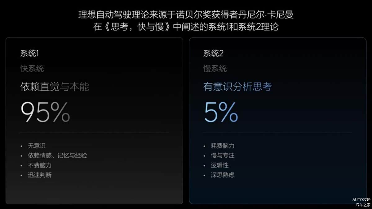 在自动驾驶的革新浪潮中,理想汽车算得上是独树一帜了,不过,理想汽车的自动驾驶全新技术架构,其实是深受诺贝尔奖殊荣获得者丹尼尔·卡尼曼快慢系统理论的启迪,旨在自动驾驶领域模拟人类的思考和决策过程,形成更智能、更拟人的驾驶解决方案。
