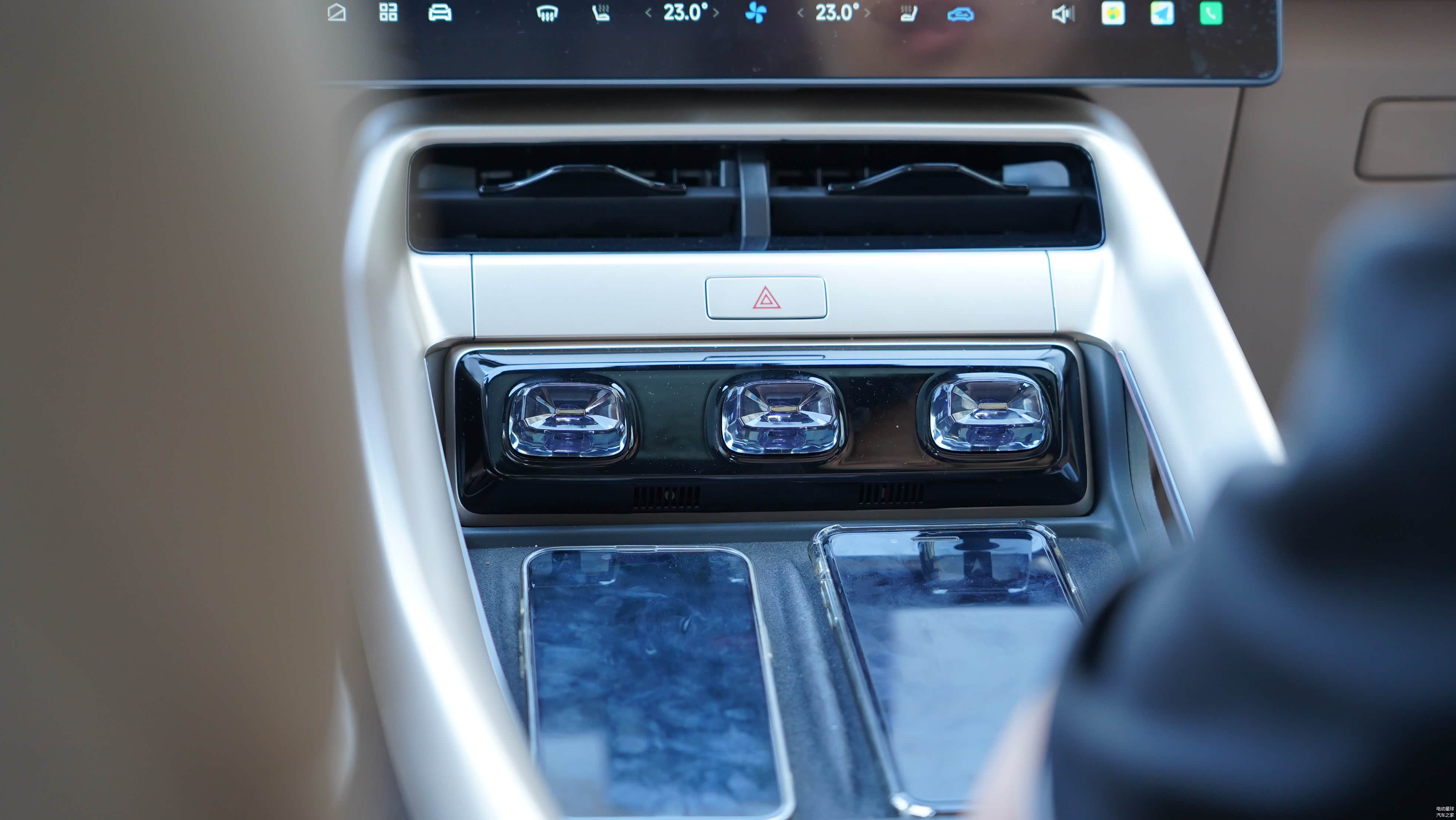 车内搭载可视化香氛系统,提供晨雾、时雨、朝露、夏夜和佛晓 5 种香氛选择,今天体验的是朝露,味道很清新,可以调节香氛的浓度,在开车的同时可以提神醒脑。
