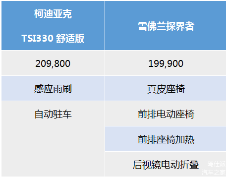 但如果和区隔其他竞争对手对比,例如雪佛兰的探界者,柯迪亚克的性价比则没有优势: