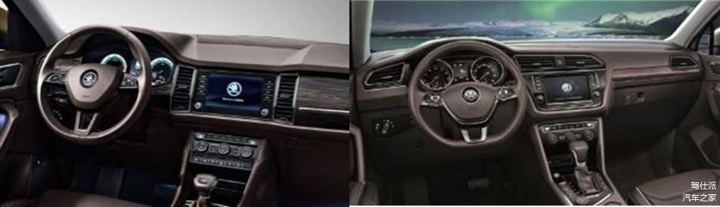 内饰上,两辆车的风格同样比较相近,柯迪亚克采用了对称式设计,而途观L采用了横向式设计。因为售价相比途观L低了不少,柯迪亚克在用料上明显打了折扣,车内大部分采用硬质材料,镀铬和银色饰条的装饰也要少一些,塑料感有些强。