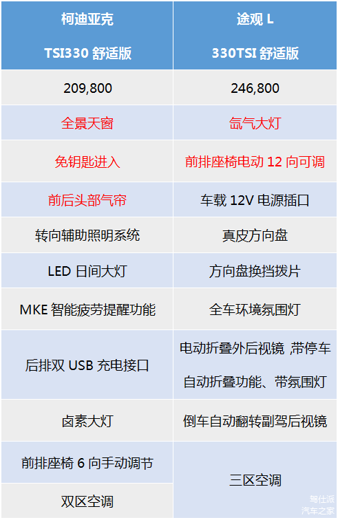 对比分析下价格配置——同为1.8T舒适版,柯迪亚克比途观L便宜了37,000元,同时还多了全景天窗、免钥匙进入、头部气帘等装备,而途观L则多了氙气大灯和电动座椅两个大件,两者装备基本相当。由此看来,和途观L对比,柯迪亚克的性价比优势还是非常明显的。