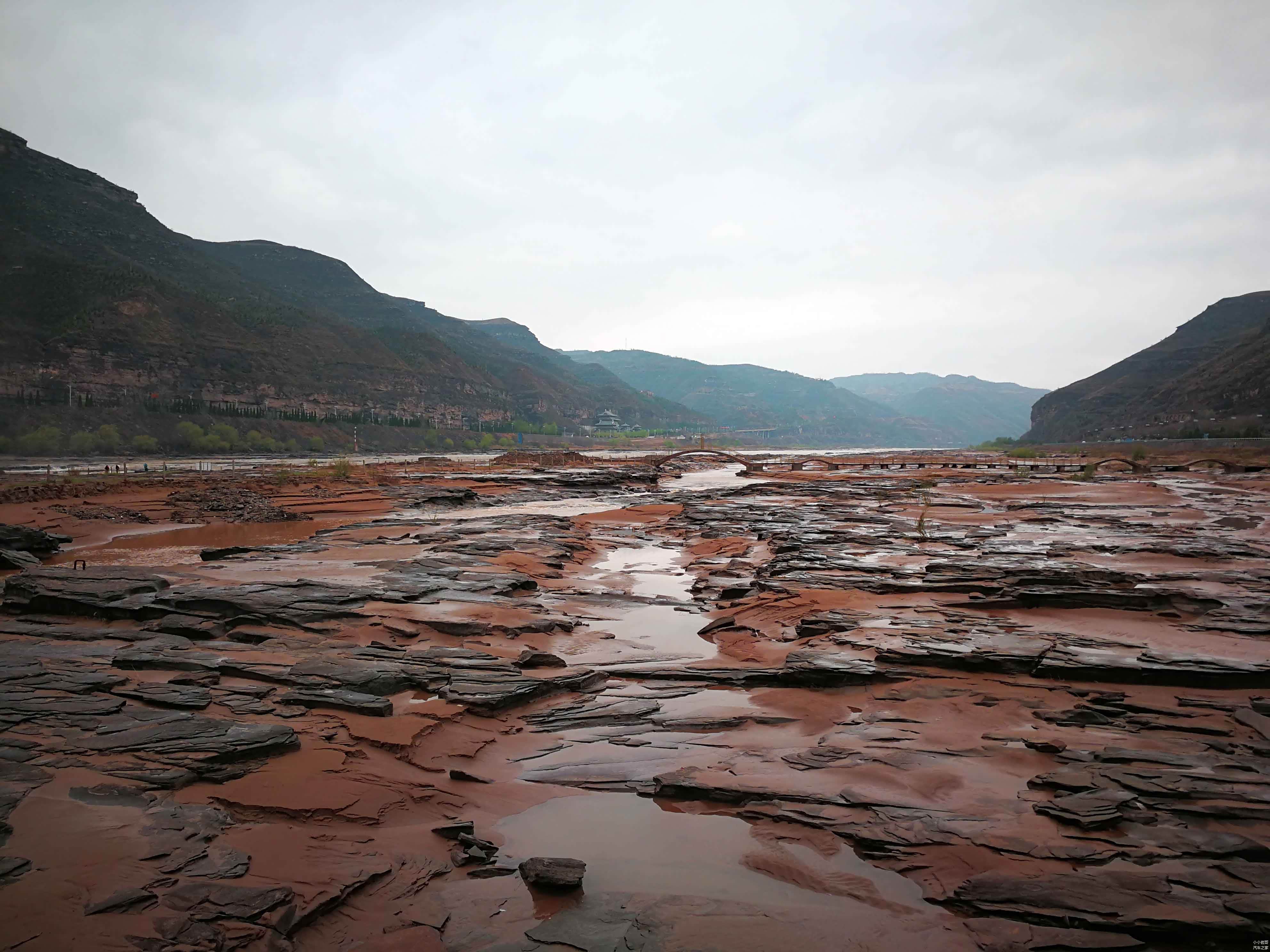 壶口瀑布两侧,低洼的水坑遍地,远方有一座小桥,再远处是连绵无尽的大山,真正的美景大多藏在深处,就好比一个美丽的西域姑娘,揭开她的纱巾前,那种朦胧的美更加诱人。
