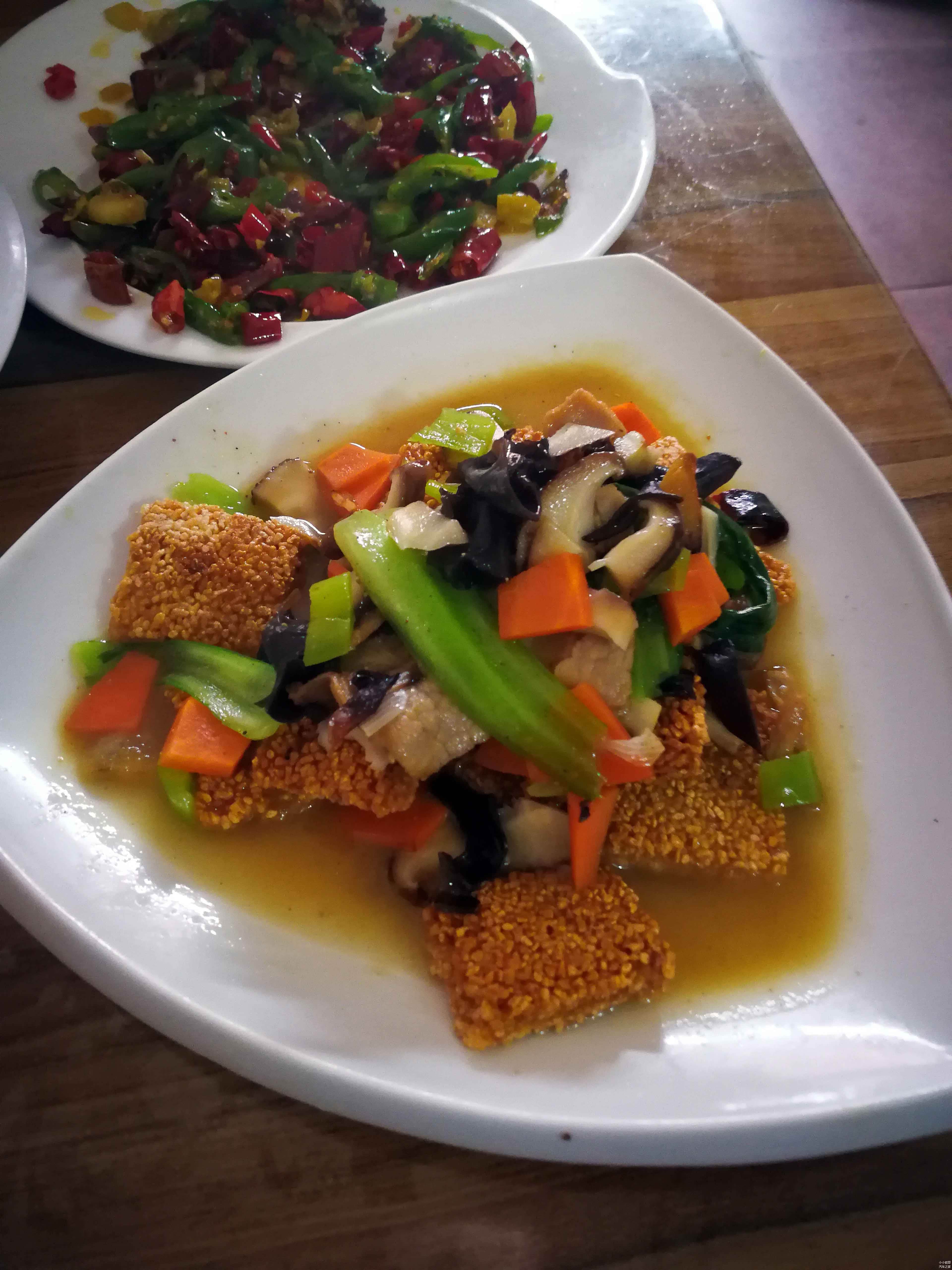 上边这道风沙鸡,外焦里嫩,油而不腻,咸口。符合北方人的口味。好评。沙棘汁,在山西、陕西等地大量种植,不仅可以绿化沙漠,其果实更是富含大量的维生素C,素有维生素之王的美称,不过味道比较酸,并不符合我的口味,可岩哥很喜欢。