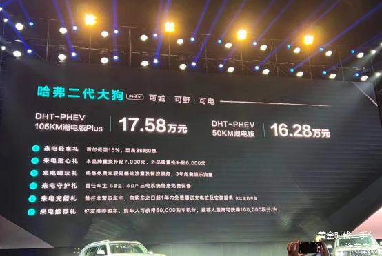 2月27日,哈弗“狗品类”首款新能源SUV, 哈弗二代大狗(图片 | 参数 | 询价)正式上市,新车共推出4款燃油版车型和2款PHEV车型,售价13.58-17.58万元。其中PHEV车型采用1.5T+2挡DHT混动的组合,WLTC综合油耗为1.85L/100km,综合续航里程超过1000km。