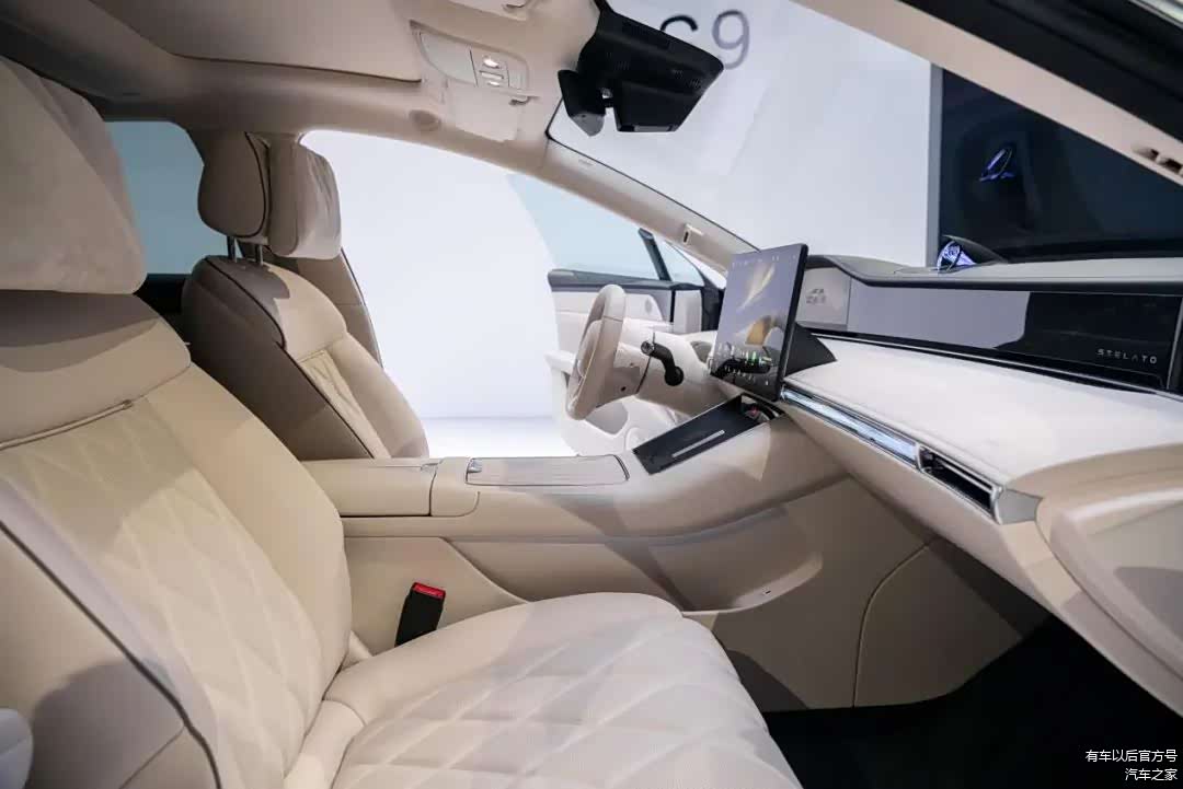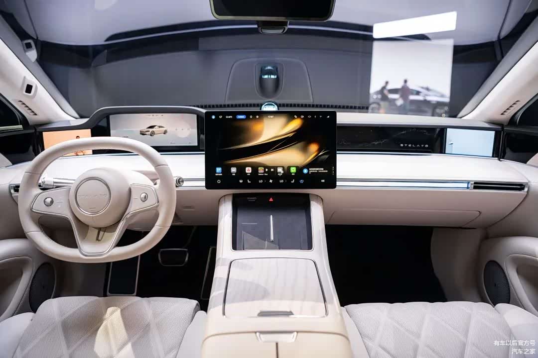 享界S9的座舱为中正对称布局,前排采用星环双露台设计,仪表台前推,上方井然有序地分布着12.3英寸全液晶仪表、15.6英寸中控大屏、双D方向盘和流媒体外后视镜屏幕,不仅兼具秩序感与科技感,前方视野也非常宽阔。