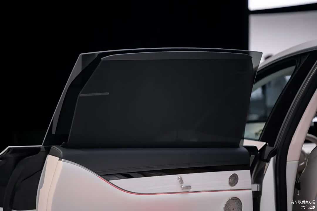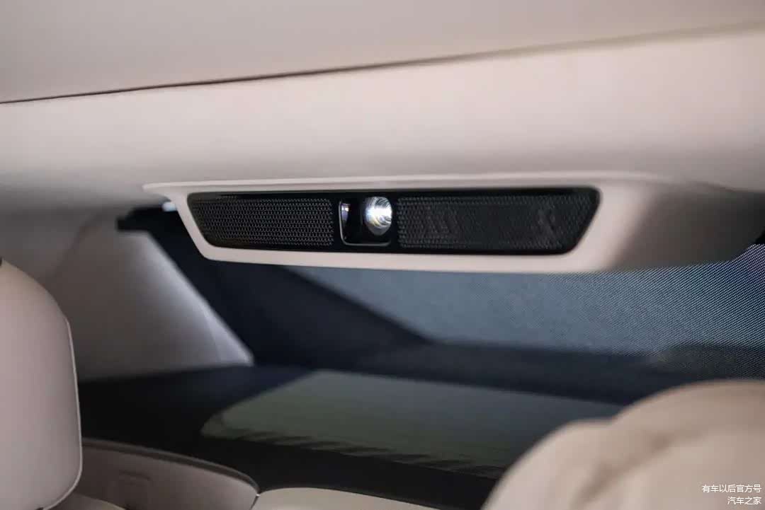 比如当一键开启影院模式,投影巨幕会自动下拉展开,车窗和电动隐私遮阳帘升起,氛围灯也会自动关闭,此时后排就会变成你的移动私人影院。当开启小憩模式后,车窗及遮阳帘升起,全车灯光关闭,配合车内播放的白噪音,实现全身心放松。