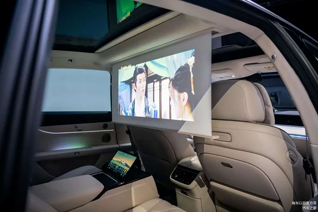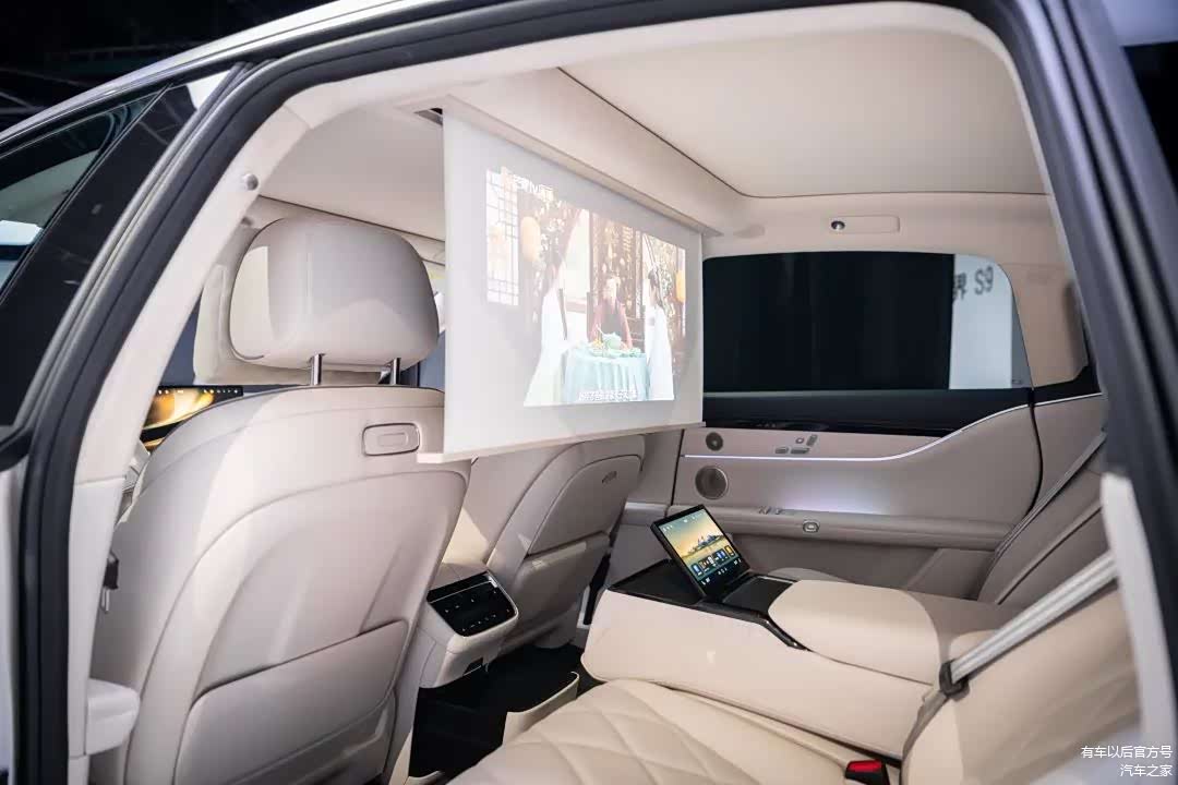 享界S9还为后排乘客安排了小桌板、大空间的双温控冷暖箱、电动隐私遮阳帘、广色域车规级投影仪、32英寸升降式投影幕布和9英寸总裁级扶手屏,堪称国宾级待遇。
