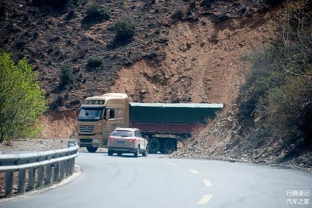 觉巴山的弯道出奇的急,以至于遇到大货车错车时,大货车不得不切弯借道。为了安全起见,小车在这样的回头弯上一定要让行,否则无法错车。