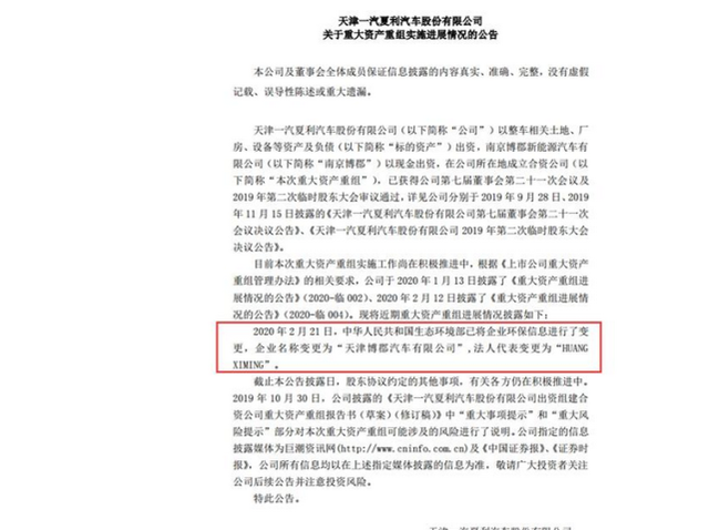 3月12日,一汽夏利发布公告称已经将企业环保信息变更为天津博郡汽车有限公司,法人代表是南京博郡CEO黄希鸣。为什么选择和夏利合作,CEO黄希鸣表示虽然夏利的经济效益不好,不过核心团队一直都在,比起厂房,设备,资质,管理团队才是最重要的。