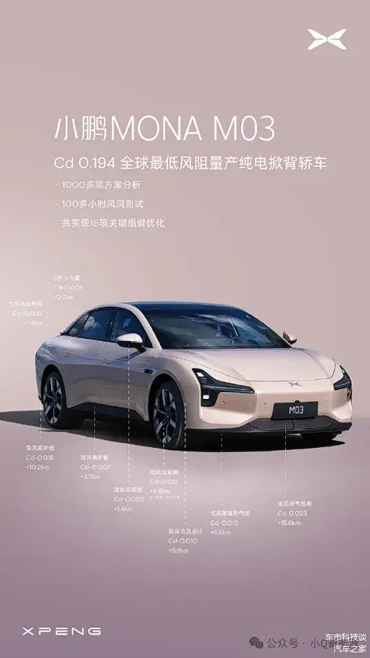 A级车内首款高颜值智能纯电掀背轿跑——小鹏MONA M03。小鹏 MONA M03 的风阻系数为 0.194 Cd,目前为全球最低。