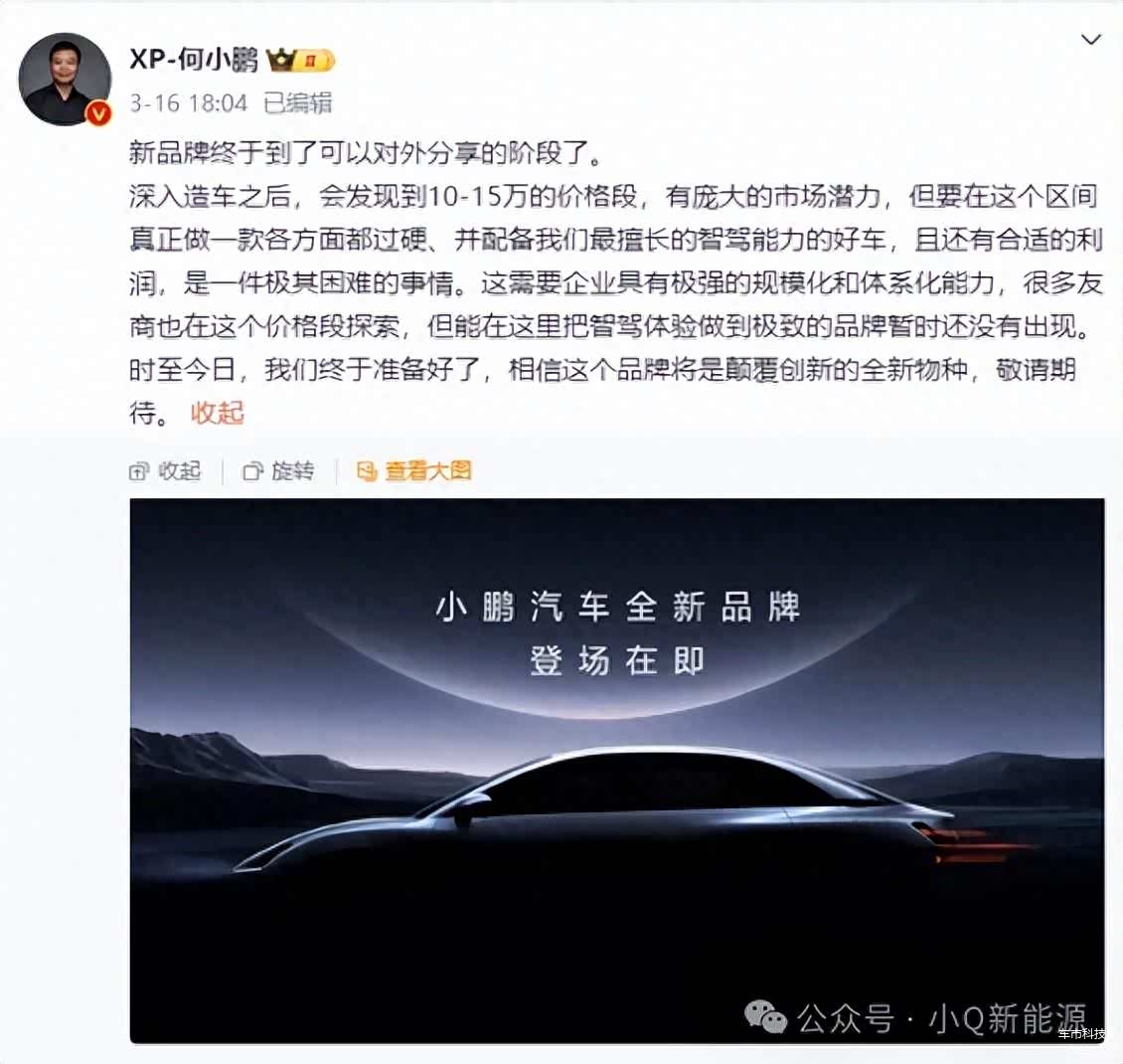 在2024年3月16日举办的中国电动汽车百人会论坛中,小鹏汽车董事长、CEO何小鹏发表演讲,首次对外披露小鹏汽车即将发布全新品牌,正式进军10-15万级全球汽车市场,新品牌在该市场价格带将颠覆技术创新,打造AI智驾新物种,为年轻人提供一台真正的AI智驾汽车。