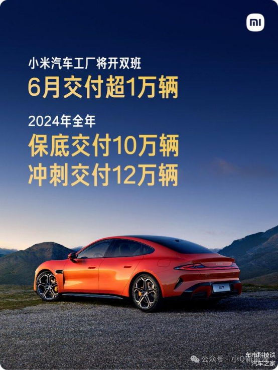 2024粤港澳大湾区车展未来汽车先行者大会上,雷军发表演讲时定下目标:全力扩产,交付提速。小米汽车今年交付10万辆,冲刺12万。