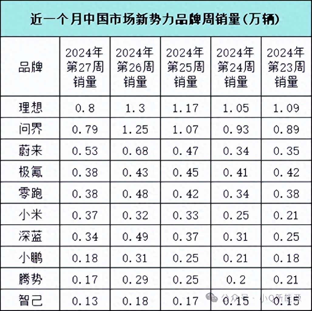昨日,国内造车新势力7月第一周榜单揭晓。理想、问界蔚来连续三周保持前三位。但销量均有大幅下滑。7月第一周,在榜的中国市场新势力品牌除了小米以外,其他各品牌周销量相较前一周均有所下降,部分品牌下滑超40%。