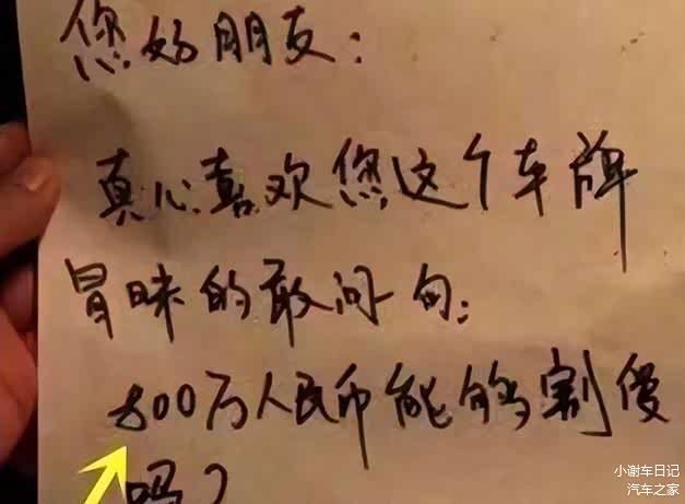 尽管车型豪华,但吸引人们注意的仍然是这个车牌。据说,这辆车停在路边被人写了一张纸条放在驾驶室的门把手上,车主看到纸条上的内容时难以置信:“你好,朋友!我真的很喜欢你的车牌,给你800万,可以忍痛割爱吗”?