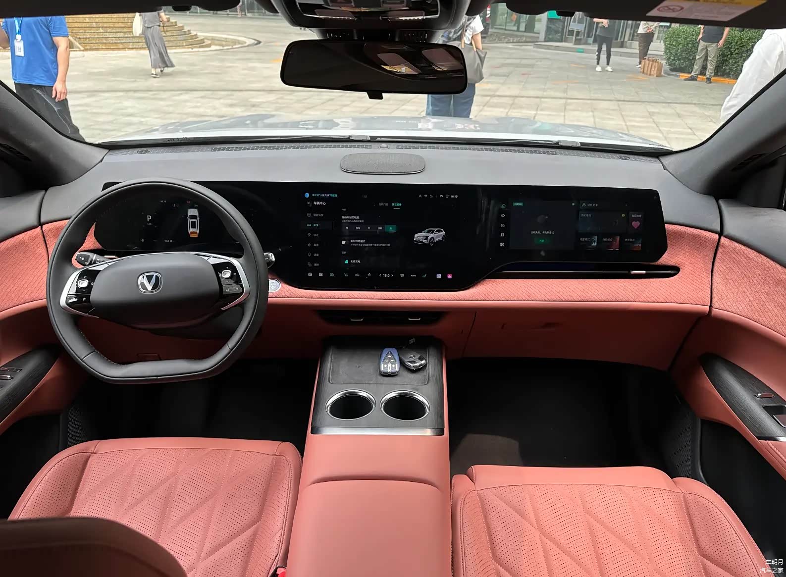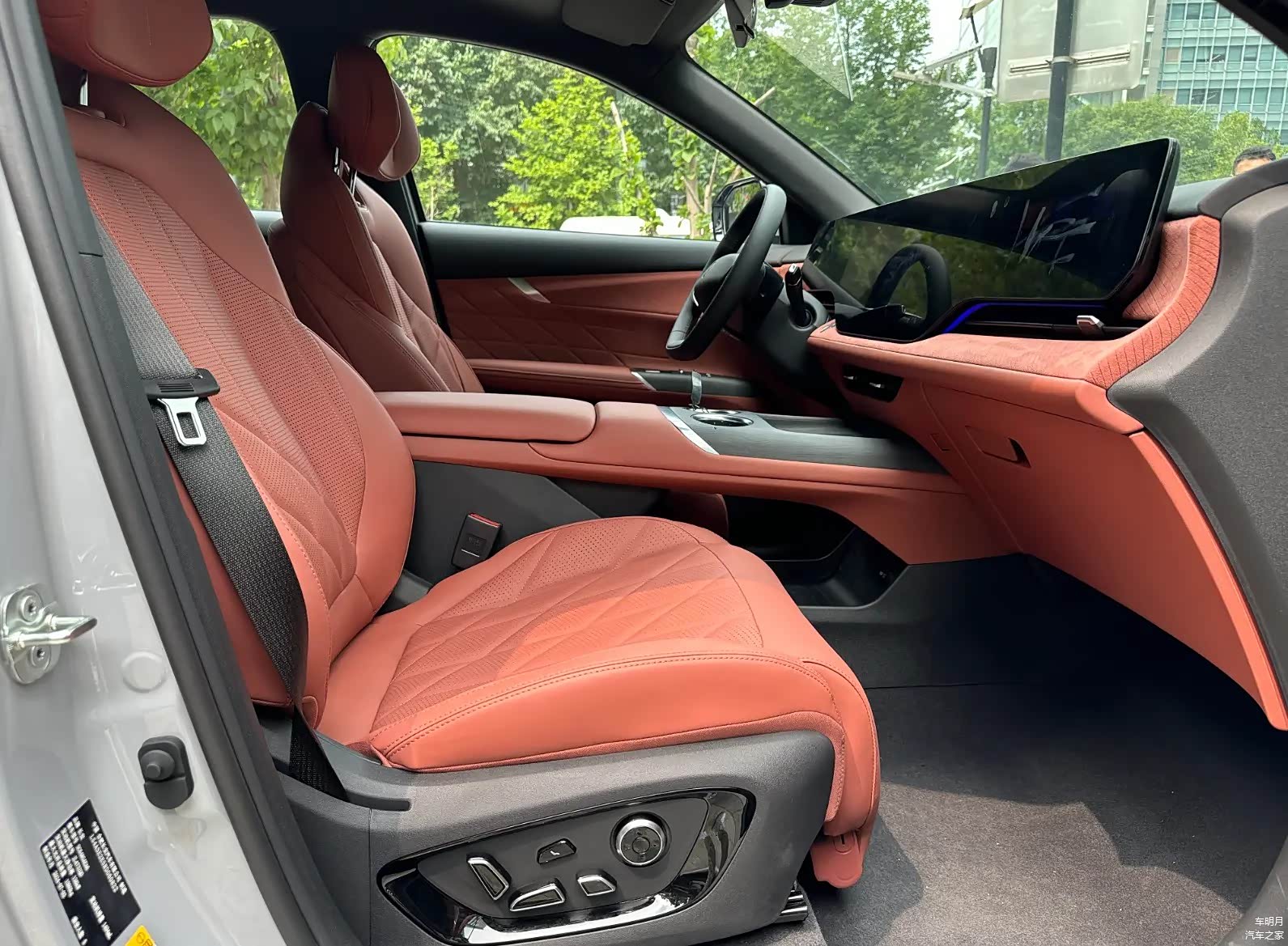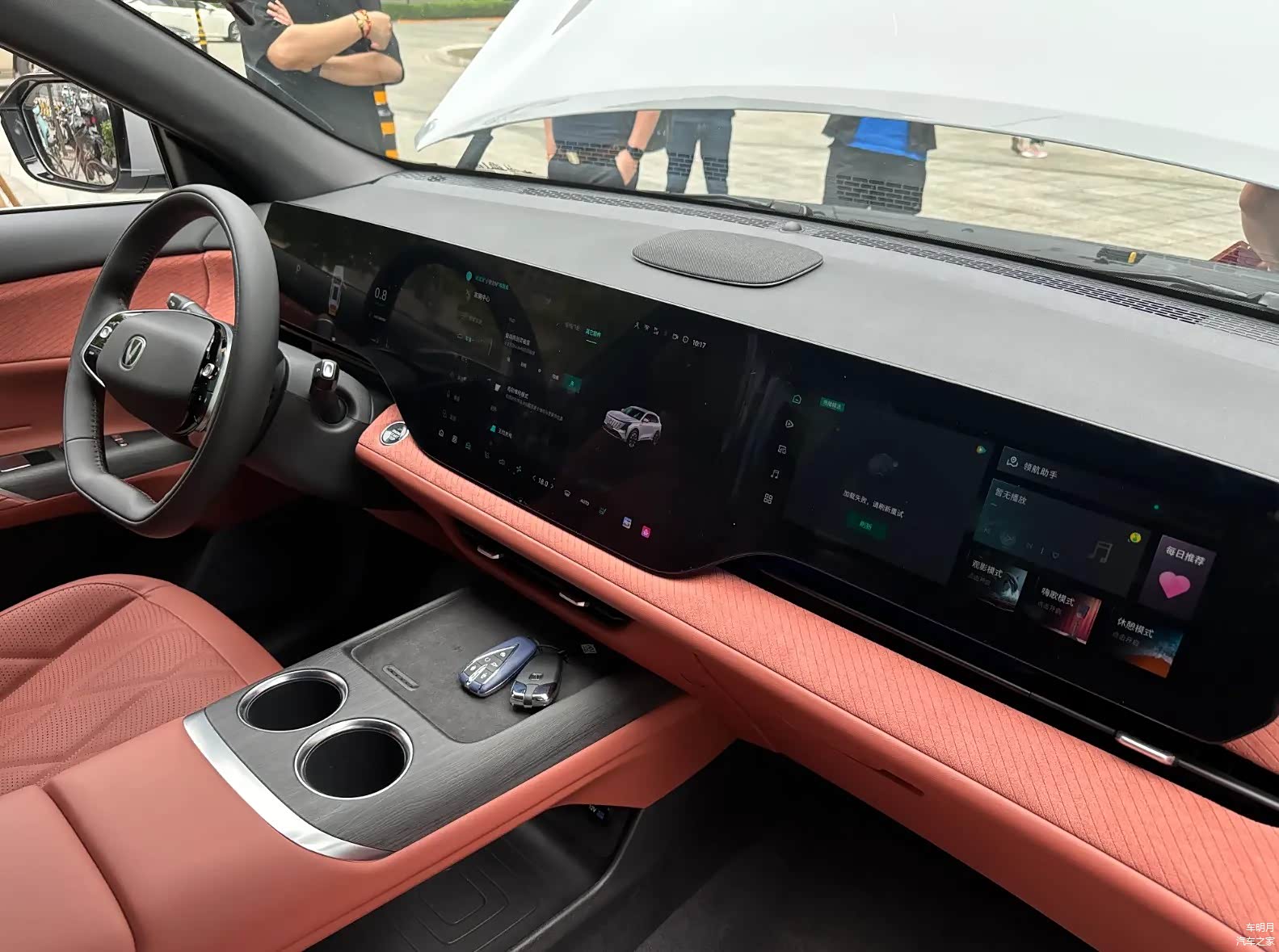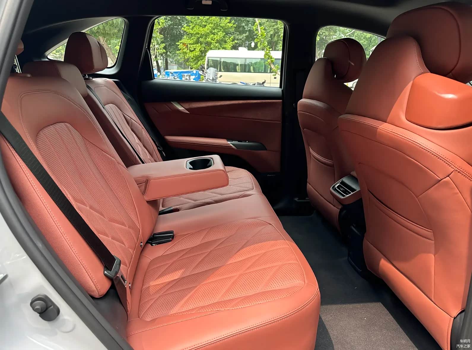 车辆的内部装饰也焕发出全新的活力,中控台设计变得更为简单。它由完全液晶的仪表板、大屏幕中控屏幕和副驾休闲屏幕组成了一个三联显示屏,再加上氛围灯具,使整个空间充满了科技氛围。红红色的设计风格与大量的真皮和麂皮相结合,并加入了木纹的装饰,从而创造了一种豪华的氛围。此外,车辆还配备了全新的双幅方向盘多功能方向、电子怀挡以及拨杆式车窗按钮等功能。扶手部分也展现出了所谓的“新能源特色”,并且配备了手机的无线电源充电功能以及一个双圆筒状的杯架。