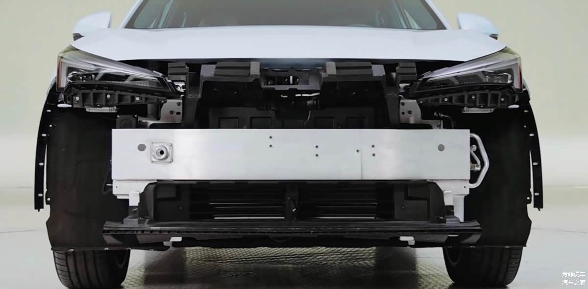 首先是车身的基础防护,汽车被碰击,第一当然就是车体的基础防护起作用,拆车视频里也可以看到保险杠下极狐阿尔法 T5前后两端的防撞梁体使用的是铝合金梁体和钢制材料,尤其是车头的防撞梁,最上方有一根尺寸巨大的缓冲发泡梁体,下面还做了一套塑料材质的缓冲支架。这两类结构都可以在低速碰撞中缓冲吸能减少车辆损失,同时也能起到保护行人的作用,但光是这些还不够,最下面极狐还加了宽度达 1, 290 毫米的铝合金梁体,从正面看可以看到这根梁体上下有两段,上面这段是一根完整梁体,截面类似目字型结构。下面这段为了避让主动进气格栅中间这块截掉了,但两段梁体背后都连接着吸能盒,这个吸能盒的截屏尺寸也是巨大,应对碰撞中能够起到不小的吸能作用,一层盖一层,极狐真的是够下本的。