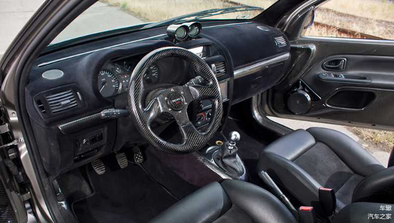 说完外观,打开车门的时候,内装又会令人再吃惊一次,虽然这款车走造型路线,但里面却充满了浓浓的战斗气息,碳纤维和Alcantara充斥了整个车厢,两张硕大的Recaro Trendlines座椅,后面还有一个鲜红色的防滚笼。看到这里,你应该相当期待引擎盖下又有什么玩意吧。
